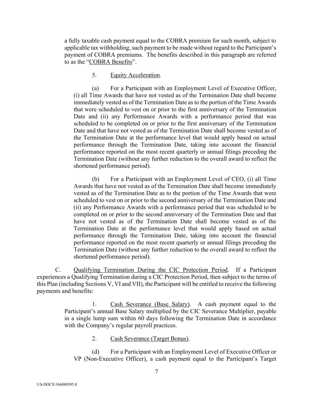 7 US-DOCS\166080585.8 a fully taxable cash payment equal to the COBRA premium for such month, subject to applicable tax withholding, such payment to be made without regard to the Participant’s payment of COBRA premiums. The benefits described in this paragraph are referred to as the “COBRA Benefits”. 5. Equity Acceleration. (a) For a Participant with an Employment Level of Executive Officer, (i) all Time Awards that have not vested as of the Termination Date shall become immediately vested as of the Termination Date as to the portion of the Time Awards that were scheduled to vest on or prior to the first anniversary of the Termination Date and (ii) any Performance Awards with a performance period that was scheduled to be completed on or prior to the first anniversary of the Termination Date and that have not vested as of the Termination Date shall become vested as of the Termination Date at the performance level that would apply based on actual performance through the Termination Date, taking into account the financial performance reported on the most recent quarterly or annual filings preceding the Termination Date (without any further reduction to the overall award to reflect the shortened performance period). (b) For a Participant with an Employment Level of CEO, (i) all Time Awards that have not vested as of the Termination Date shall become immediately vested as of the Termination Date as to the portion of the Time Awards that were scheduled to vest on or prior to the second anniversary of the Termination Date and (ii) any Performance Awards with a performance period that was scheduled to be completed on or prior to the second anniversary of the Termination Date and that have not vested as of the Termination Date shall become vested as of the Termination Date at the performance level that would apply based on actual performance through the Termination Date, taking into account the financial performance reported on the most recent quarterly or annual filings preceding the Termination Date (without any further reduction to the overall award to reflect the shortened performance period). C. Qualifying Termination During the CIC Protection Period. If a Participant experiences a Qualifying Termination during a CIC Protection Period, then subject to the terms of this Plan (including Sections V, VI and VII), the Participant will be entitled to receive the following payments and benefits: 1. Cash Severance (Base Salary). A cash payment equal to the Participant’s annual Base Salary multiplied by the CIC Severance Multiplier, payable in a single lump sum within 60 days following the Termination Date in accordance with the Company’s regular payroll practices. 2. Cash Severance (Target Bonus). (d) For a Participant with an Employment Level of Executive Officer or VP (Non-Executive Officer), a cash payment equal to the Participant’s Target