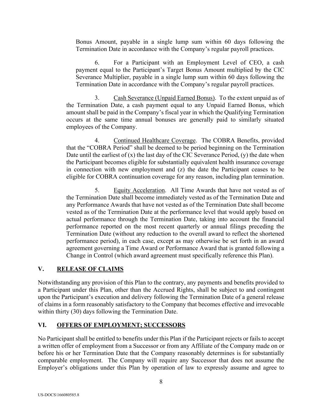8 US-DOCS\166080585.8 Bonus Amount, payable in a single lump sum within 60 days following the Termination Date in accordance with the Company’s regular payroll practices. 6. For a Participant with an Employment Level of CEO, a cash payment equal to the Participant’s Target Bonus Amount multiplied by the CIC Severance Multiplier, payable in a single lump sum within 60 days following the Termination Date in accordance with the Company’s regular payroll practices. 3. Cash Severance (Unpaid Earned Bonus). To the extent unpaid as of the Termination Date, a cash payment equal to any Unpaid Earned Bonus, which amount shall be paid in the Company’s fiscal year in which the Qualifying Termination occurs at the same time annual bonuses are generally paid to similarly situated employees of the Company. 4. Continued Healthcare Coverage. The COBRA Benefits, provided that the “COBRA Period” shall be deemed to be period beginning on the Termination Date until the earliest of (x) the last day of the CIC Severance Period, (y) the date when the Participant becomes eligible for substantially equivalent health insurance coverage in connection with new employment and (z) the date the Participant ceases to be eligible for COBRA continuation coverage for any reason, including plan termination. 5. Equity Acceleration. All Time Awards that have not vested as of the Termination Date shall become immediately vested as of the Termination Date and any Performance Awards that have not vested as of the Termination Date shall become vested as of the Termination Date at the performance level that would apply based on actual performance through the Termination Date, taking into account the financial performance reported on the most recent quarterly or annual filings preceding the Termination Date (without any reduction to the overall award to reflect the shortened performance period), in each case, except as may otherwise be set forth in an award agreement governing a Time Award or Performance Award that is granted following a Change in Control (which award agreement must specifically reference this Plan). V. RELEASE OF CLAIMS Notwithstanding any provision of this Plan to the contrary, any payments and benefits provided to a Participant under this Plan, other than the Accrued Rights, shall be subject to and contingent upon the Participant’s execution and delivery following the Termination Date of a general release of claims in a form reasonably satisfactory to the Company that becomes effective and irrevocable within thirty (30) days following the Termination Date. VI. OFFERS OF EMPLOYMENT; SUCCESSORS No Participant shall be entitled to benefits under this Plan if the Participant rejects or fails to accept a written offer of employment from a Successor or from any Affiliate of the Company made on or before his or her Termination Date that the Company reasonably determines is for substantially comparable employment. The Company will require any Successor that does not assume the Employer’s obligations under this Plan by operation of law to expressly assume and agree to