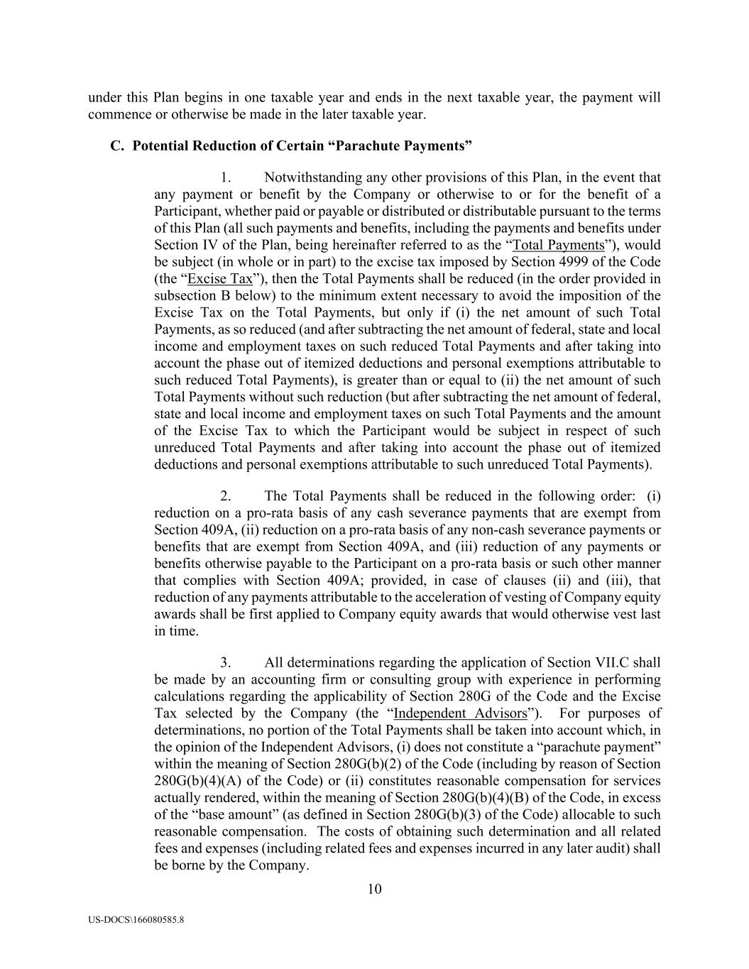 10 US-DOCS\166080585.8 under this Plan begins in one taxable year and ends in the next taxable year, the payment will commence or otherwise be made in the later taxable year. C. Potential Reduction of Certain “Parachute Payments” 1. Notwithstanding any other provisions of this Plan, in the event that any payment or benefit by the Company or otherwise to or for the benefit of a Participant, whether paid or payable or distributed or distributable pursuant to the terms of this Plan (all such payments and benefits, including the payments and benefits under Section IV of the Plan, being hereinafter referred to as the “Total Payments”), would be subject (in whole or in part) to the excise tax imposed by Section 4999 of the Code (the “Excise Tax”), then the Total Payments shall be reduced (in the order provided in subsection B below) to the minimum extent necessary to avoid the imposition of the Excise Tax on the Total Payments, but only if (i) the net amount of such Total Payments, as so reduced (and after subtracting the net amount of federal, state and local income and employment taxes on such reduced Total Payments and after taking into account the phase out of itemized deductions and personal exemptions attributable to such reduced Total Payments), is greater than or equal to (ii) the net amount of such Total Payments without such reduction (but after subtracting the net amount of federal, state and local income and employment taxes on such Total Payments and the amount of the Excise Tax to which the Participant would be subject in respect of such unreduced Total Payments and after taking into account the phase out of itemized deductions and personal exemptions attributable to such unreduced Total Payments). 2. The Total Payments shall be reduced in the following order: (i) reduction on a pro-rata basis of any cash severance payments that are exempt from Section 409A, (ii) reduction on a pro-rata basis of any non-cash severance payments or benefits that are exempt from Section 409A, and (iii) reduction of any payments or benefits otherwise payable to the Participant on a pro-rata basis or such other manner that complies with Section 409A; provided, in case of clauses (ii) and (iii), that reduction of any payments attributable to the acceleration of vesting of Company equity awards shall be first applied to Company equity awards that would otherwise vest last in time. 3. All determinations regarding the application of Section VII.C shall be made by an accounting firm or consulting group with experience in performing calculations regarding the applicability of Section 280G of the Code and the Excise Tax selected by the Company (the “Independent Advisors”). For purposes of determinations, no portion of the Total Payments shall be taken into account which, in the opinion of the Independent Advisors, (i) does not constitute a “parachute payment” within the meaning of Section 280G(b)(2) of the Code (including by reason of Section 280G(b)(4)(A) of the Code) or (ii) constitutes reasonable compensation for services actually rendered, within the meaning of Section 280G(b)(4)(B) of the Code, in excess of the “base amount” (as defined in Section 280G(b)(3) of the Code) allocable to such reasonable compensation. The costs of obtaining such determination and all related fees and expenses (including related fees and expenses incurred in any later audit) shall be borne by the Company.