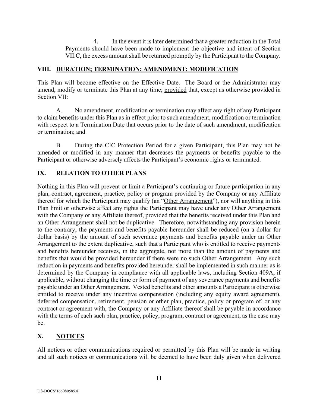 11 US-DOCS\166080585.8 4. In the event it is later determined that a greater reduction in the Total Payments should have been made to implement the objective and intent of Section VII.C, the excess amount shall be returned promptly by the Participant to the Company. VIII. DURATION; TERMINATION; AMENDMENT; MODIFICATION This Plan will become effective on the Effective Date. The Board or the Administrator may amend, modify or terminate this Plan at any time; provided that, except as otherwise provided in Section VII: A. No amendment, modification or termination may affect any right of any Participant to claim benefits under this Plan as in effect prior to such amendment, modification or termination with respect to a Termination Date that occurs prior to the date of such amendment, modification or termination; and B. During the CIC Protection Period for a given Participant, this Plan may not be amended or modified in any manner that decreases the payments or benefits payable to the Participant or otherwise adversely affects the Participant’s economic rights or terminated. IX. RELATION TO OTHER PLANS Nothing in this Plan will prevent or limit a Participant’s continuing or future participation in any plan, contract, agreement, practice, policy or program provided by the Company or any Affiliate thereof for which the Participant may qualify (an “Other Arrangement”), nor will anything in this Plan limit or otherwise affect any rights the Participant may have under any Other Arrangement with the Company or any Affiliate thereof, provided that the benefits received under this Plan and an Other Arrangement shall not be duplicative. Therefore, notwithstanding any provision herein to the contrary, the payments and benefits payable hereunder shall be reduced (on a dollar for dollar basis) by the amount of such severance payments and benefits payable under an Other Arrangement to the extent duplicative, such that a Participant who is entitled to receive payments and benefits hereunder receives, in the aggregate, not more than the amount of payments and benefits that would be provided hereunder if there were no such Other Arrangement. Any such reduction in payments and benefits provided hereunder shall be implemented in such manner as is determined by the Company in compliance with all applicable laws, including Section 409A, if applicable, without changing the time or form of payment of any severance payments and benefits payable under an Other Arrangement. Vested benefits and other amounts a Participant is otherwise entitled to receive under any incentive compensation (including any equity award agreement), deferred compensation, retirement, pension or other plan, practice, policy or program of, or any contract or agreement with, the Company or any Affiliate thereof shall be payable in accordance with the terms of each such plan, practice, policy, program, contract or agreement, as the case may be. X. NOTICES All notices or other communications required or permitted by this Plan will be made in writing and all such notices or communications will be deemed to have been duly given when delivered