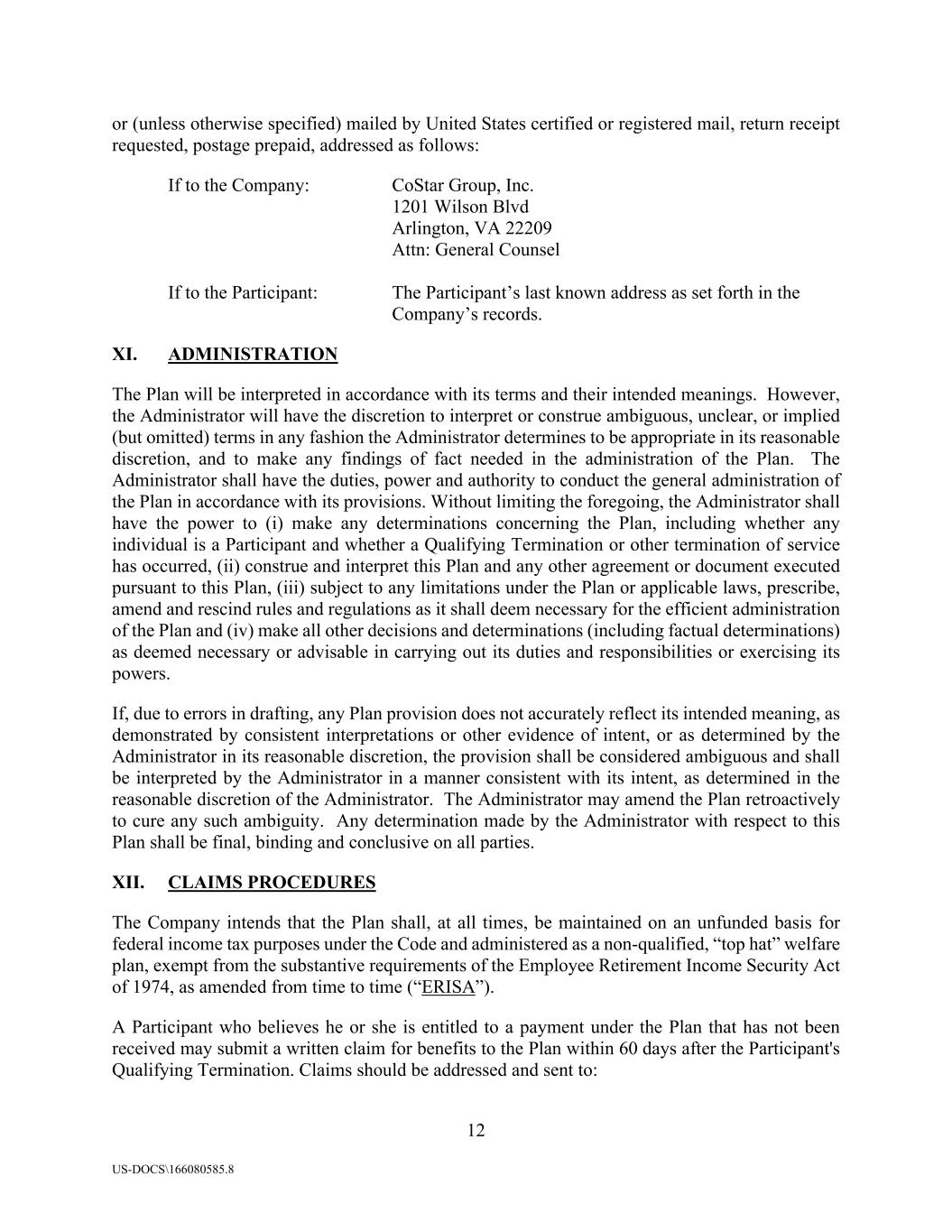 12 US-DOCS\166080585.8 or (unless otherwise specified) mailed by United States certified or registered mail, return receipt requested, postage prepaid, addressed as follows: If to the Company: CoStar Group, Inc. 1201 Wilson Blvd Arlington, VA 22209 Attn: General Counsel If to the Participant: The Participant’s last known address as set forth in the Company’s records. XI. ADMINISTRATION The Plan will be interpreted in accordance with its terms and their intended meanings. However, the Administrator will have the discretion to interpret or construe ambiguous, unclear, or implied (but omitted) terms in any fashion the Administrator determines to be appropriate in its reasonable discretion, and to make any findings of fact needed in the administration of the Plan. The Administrator shall have the duties, power and authority to conduct the general administration of the Plan in accordance with its provisions. Without limiting the foregoing, the Administrator shall have the power to (i) make any determinations concerning the Plan, including whether any individual is a Participant and whether a Qualifying Termination or other termination of service has occurred, (ii) construe and interpret this Plan and any other agreement or document executed pursuant to this Plan, (iii) subject to any limitations under the Plan or applicable laws, prescribe, amend and rescind rules and regulations as it shall deem necessary for the efficient administration of the Plan and (iv) make all other decisions and determinations (including factual determinations) as deemed necessary or advisable in carrying out its duties and responsibilities or exercising its powers. If, due to errors in drafting, any Plan provision does not accurately reflect its intended meaning, as demonstrated by consistent interpretations or other evidence of intent, or as determined by the Administrator in its reasonable discretion, the provision shall be considered ambiguous and shall be interpreted by the Administrator in a manner consistent with its intent, as determined in the reasonable discretion of the Administrator. The Administrator may amend the Plan retroactively to cure any such ambiguity. Any determination made by the Administrator with respect to this Plan shall be final, binding and conclusive on all parties. XII. CLAIMS PROCEDURES The Company intends that the Plan shall, at all times, be maintained on an unfunded basis for federal income tax purposes under the Code and administered as a non-qualified, “top hat” welfare plan, exempt from the substantive requirements of the Employee Retirement Income Security Act of 1974, as amended from time to time (“ERISA”). A Participant who believes he or she is entitled to a payment under the Plan that has not been received may submit a written claim for benefits to the Plan within 60 days after the Participant's Qualifying Termination. Claims should be addressed and sent to: