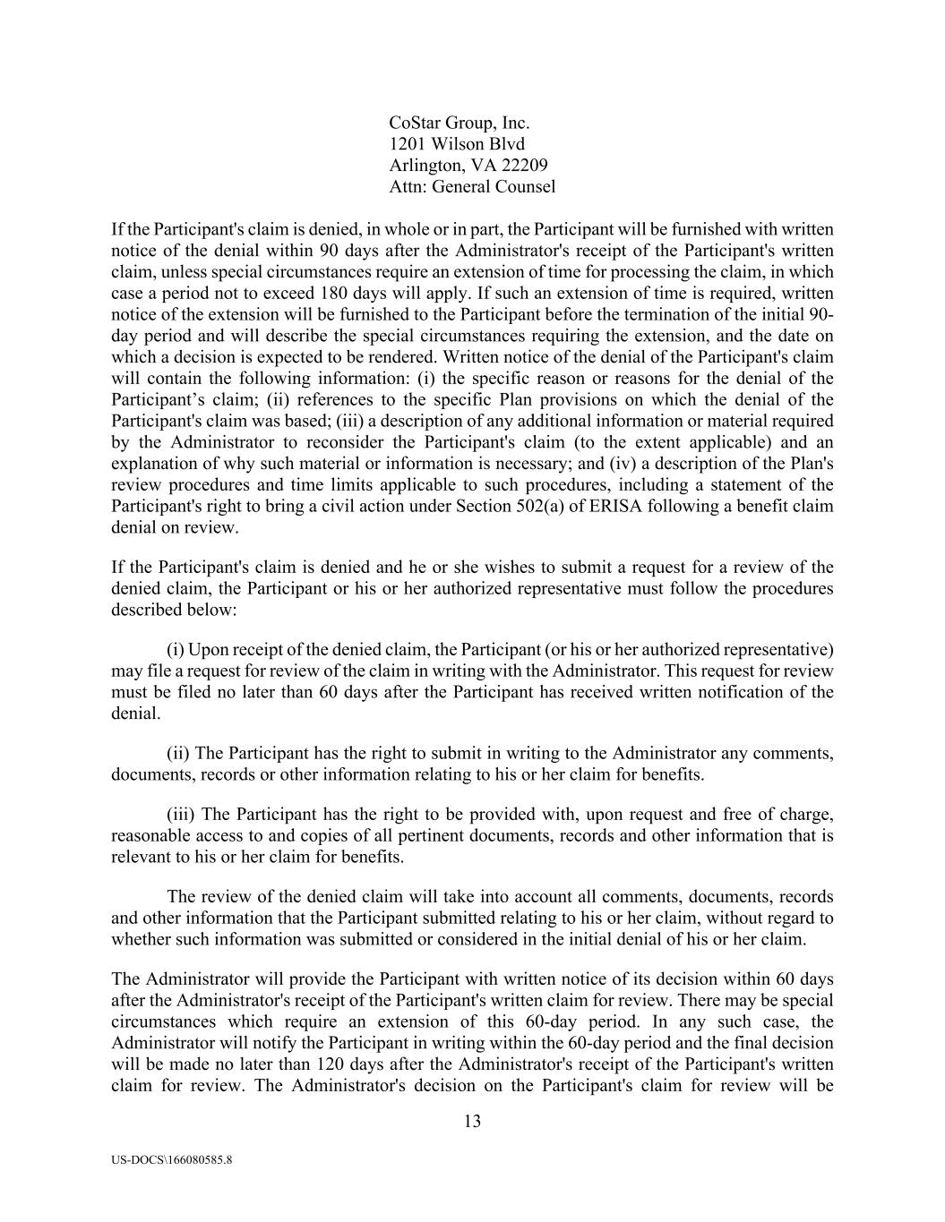 13 US-DOCS\166080585.8 CoStar Group, Inc. 1201 Wilson Blvd Arlington, VA 22209 Attn: General Counsel If the Participant's claim is denied, in whole or in part, the Participant will be furnished with written notice of the denial within 90 days after the Administrator's receipt of the Participant's written claim, unless special circumstances require an extension of time for processing the claim, in which case a period not to exceed 180 days will apply. If such an extension of time is required, written notice of the extension will be furnished to the Participant before the termination of the initial 90- day period and will describe the special circumstances requiring the extension, and the date on which a decision is expected to be rendered. Written notice of the denial of the Participant's claim will contain the following information: (i) the specific reason or reasons for the denial of the Participant’s claim; (ii) references to the specific Plan provisions on which the denial of the Participant's claim was based; (iii) a description of any additional information or material required by the Administrator to reconsider the Participant's claim (to the extent applicable) and an explanation of why such material or information is necessary; and (iv) a description of the Plan's review procedures and time limits applicable to such procedures, including a statement of the Participant's right to bring a civil action under Section 502(a) of ERISA following a benefit claim denial on review. If the Participant's claim is denied and he or she wishes to submit a request for a review of the denied claim, the Participant or his or her authorized representative must follow the procedures described below: (i) Upon receipt of the denied claim, the Participant (or his or her authorized representative) may file a request for review of the claim in writing with the Administrator. This request for review must be filed no later than 60 days after the Participant has received written notification of the denial. (ii) The Participant has the right to submit in writing to the Administrator any comments, documents, records or other information relating to his or her claim for benefits. (iii) The Participant has the right to be provided with, upon request and free of charge, reasonable access to and copies of all pertinent documents, records and other information that is relevant to his or her claim for benefits. The review of the denied claim will take into account all comments, documents, records and other information that the Participant submitted relating to his or her claim, without regard to whether such information was submitted or considered in the initial denial of his or her claim. The Administrator will provide the Participant with written notice of its decision within 60 days after the Administrator's receipt of the Participant's written claim for review. There may be special circumstances which require an extension of this 60-day period. In any such case, the Administrator will notify the Participant in writing within the 60-day period and the final decision will be made no later than 120 days after the Administrator's receipt of the Participant's written claim for review. The Administrator's decision on the Participant's claim for review will be