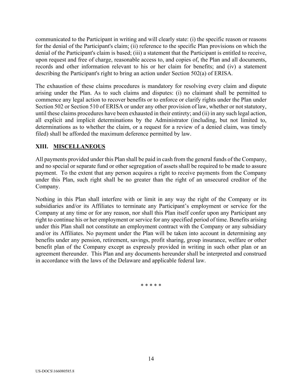 14 US-DOCS\166080585.8 communicated to the Participant in writing and will clearly state: (i) the specific reason or reasons for the denial of the Participant's claim; (ii) reference to the specific Plan provisions on which the denial of the Participant's claim is based; (iii) a statement that the Participant is entitled to receive, upon request and free of charge, reasonable access to, and copies of, the Plan and all documents, records and other information relevant to his or her claim for benefits; and (iv) a statement describing the Participant's right to bring an action under Section 502(a) of ERISA. The exhaustion of these claims procedures is mandatory for resolving every claim and dispute arising under the Plan. As to such claims and disputes: (i) no claimant shall be permitted to commence any legal action to recover benefits or to enforce or clarify rights under the Plan under Section 502 or Section 510 of ERISA or under any other provision of law, whether or not statutory, until these claims procedures have been exhausted in their entirety; and (ii) in any such legal action, all explicit and implicit determinations by the Administrator (including, but not limited to, determinations as to whether the claim, or a request for a review of a denied claim, was timely filed) shall be afforded the maximum deference permitted by law. XIII. MISCELLANEOUS All payments provided under this Plan shall be paid in cash from the general funds of the Company, and no special or separate fund or other segregation of assets shall be required to be made to assure payment. To the extent that any person acquires a right to receive payments from the Company under this Plan, such right shall be no greater than the right of an unsecured creditor of the Company. Nothing in this Plan shall interfere with or limit in any way the right of the Company or its subsidiaries and/or its Affiliates to terminate any Participant’s employment or service for the Company at any time or for any reason, nor shall this Plan itself confer upon any Participant any right to continue his or her employment or service for any specified period of time. Benefits arising under this Plan shall not constitute an employment contract with the Company or any subsidiary and/or its Affiliates. No payment under the Plan will be taken into account in determining any benefits under any pension, retirement, savings, profit sharing, group insurance, welfare or other benefit plan of the Company except as expressly provided in writing in such other plan or an agreement thereunder. This Plan and any documents hereunder shall be interpreted and construed in accordance with the laws of the Delaware and applicable federal law. * * * * *