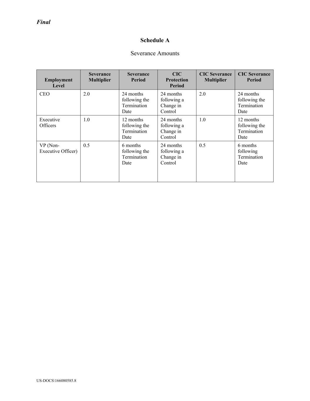 Final US-DOCS\166080585.8 Schedule A Severance Amounts Employment Level Severance Multiplier Severance Period CIC Protection Period CIC Severance Multiplier CIC Severance Period CEO 2.0 24 months following the Termination Date 24 months following a Change in Control 2.0 24 months following the Termination Date Executive Officers 1.0 12 months following the Termination Date 24 months following a Change in Control 1.0 12 months following the Termination Date VP (Non- Executive Officer) 0.5 6 months following the Termination Date 24 months following a Change in Control 0.5 6 months following Termination Date