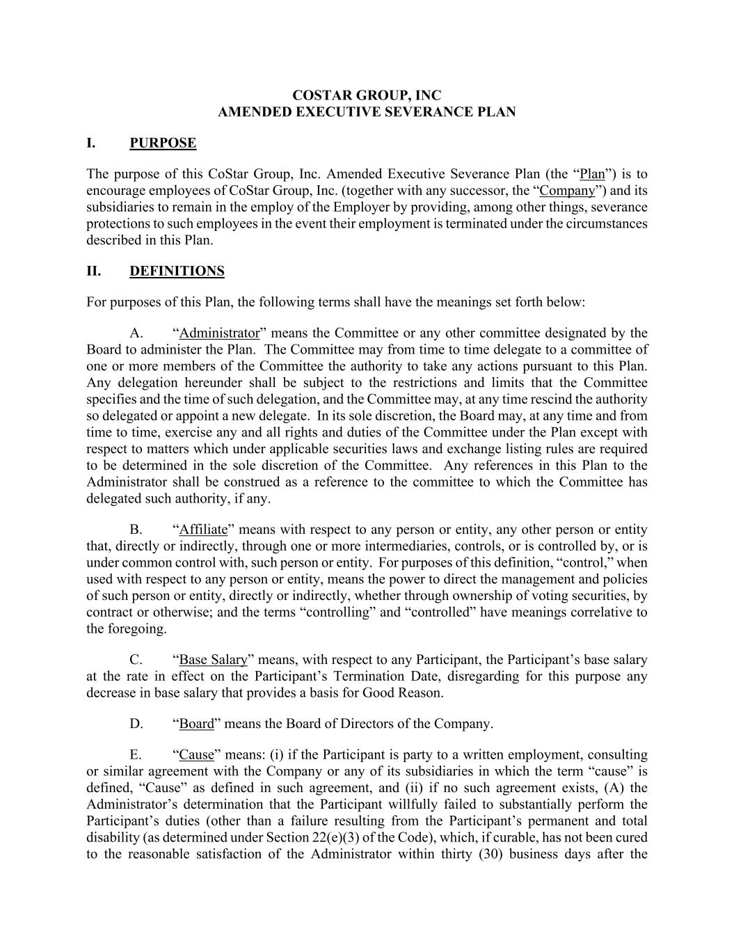 COSTAR GROUP, INC AMENDED EXECUTIVE SEVERANCE PLAN I. PURPOSE The purpose of this CoStar Group, Inc. Amended Executive Severance Plan (the “Plan”) is to encourage employees of CoStar Group, Inc. (together with any successor, the “Company”) and its subsidiaries to remain in the employ of the Employer by providing, among other things, severance protections to such employees in the event their employment is terminated under the circumstances described in this Plan. II. DEFINITIONS For purposes of this Plan, the following terms shall have the meanings set forth below: A. “Administrator” means the Committee or any other committee designated by the Board to administer the Plan. The Committee may from time to time delegate to a committee of one or more members of the Committee the authority to take any actions pursuant to this Plan. Any delegation hereunder shall be subject to the restrictions and limits that the Committee specifies and the time of such delegation, and the Committee may, at any time rescind the authority so delegated or appoint a new delegate. In its sole discretion, the Board may, at any time and from time to time, exercise any and all rights and duties of the Committee under the Plan except with respect to matters which under applicable securities laws and exchange listing rules are required to be determined in the sole discretion of the Committee. Any references in this Plan to the Administrator shall be construed as a reference to the committee to which the Committee has delegated such authority, if any. B. “Affiliate” means with respect to any person or entity, any other person or entity that, directly or indirectly, through one or more intermediaries, controls, or is controlled by, or is under common control with, such person or entity. For purposes of this definition, “control,” when used with respect to any person or entity, means the power to direct the management and policies of such person or entity, directly or indirectly, whether through ownership of voting securities, by contract or otherwise; and the terms “controlling” and “controlled” have meanings correlative to the foregoing. C. “Base Salary” means, with respect to any Participant, the Participant’s base salary at the rate in effect on the Participant’s Termination Date, disregarding for this purpose any decrease in base salary that provides a basis for Good Reason. D. “Board” means the Board of Directors of the Company. E. “Cause” means: (i) if the Participant is party to a written employment, consulting or similar agreement with the Company or any of its subsidiaries in which the term “cause” is defined, “Cause” as defined in such agreement, and (ii) if no such agreement exists, (A) the Administrator’s determination that the Participant willfully failed to substantially perform the Participant’s duties (other than a failure resulting from the Participant’s permanent and total disability (as determined under Section 22(e)(3) of the Code), which, if curable, has not been cured to the reasonable satisfaction of the Administrator within thirty (30) business days after the