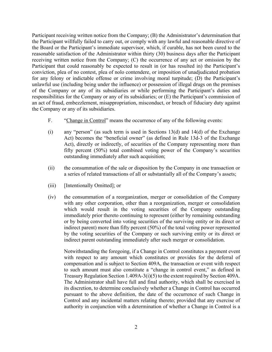 2 Participant receiving written notice from the Company; (B) the Administrator’s determination that the Participant willfully failed to carry out, or comply with any lawful and reasonable directive of the Board or the Participant’s immediate supervisor, which, if curable, has not been cured to the reasonable satisfaction of the Administrator within thirty (30) business days after the Participant receiving written notice from the Company; (C) the occurrence of any act or omission by the Participant that could reasonably be expected to result in (or has resulted in) the Participant’s conviction, plea of no contest, plea of nolo contendere, or imposition of unadjudicated probation for any felony or indictable offense or crime involving moral turpitude; (D) the Participant’s unlawful use (including being under the influence) or possession of illegal drugs on the premises of the Company or any of its subsidiaries or while performing the Participant’s duties and responsibilities for the Company or any of its subsidiaries; or (E) the Participant’s commission of an act of fraud, embezzlement, misappropriation, misconduct, or breach of fiduciary duty against the Company or any of its subsidiaries. F. “Change in Control” means the occurrence of any of the following events: (i) any “person” (as such term is used in Sections 13(d) and 14(d) of the Exchange Act) becomes the “beneficial owner” (as defined in Rule 13d-3 of the Exchange Act), directly or indirectly, of securities of the Company representing more than fifty percent (50%) total combined voting power of the Company’s securities outstanding immediately after such acquisition; (ii) the consummation of the sale or disposition by the Company in one transaction or a series of related transactions of all or substantially all of the Company’s assets; (iii) [Intentionally Omitted]; or (iv) the consummation of a reorganization, merger or consolidation of the Company with any other corporation, other than a reorganization, merger or consolidation which would result in the voting securities of the Company outstanding immediately prior thereto continuing to represent (either by remaining outstanding or by being converted into voting securities of the surviving entity or its direct or indirect parent) more than fifty percent (50%) of the total voting power represented by the voting securities of the Company or such surviving entity or its direct or indirect parent outstanding immediately after such merger or consolidation. Notwithstanding the foregoing, if a Change in Control constitutes a payment event with respect to any amount which constitutes or provides for the deferral of compensation and is subject to Section 409A, the transaction or event with respect to such amount must also constitute a “change in control event,” as defined in Treasury Regulation Section 1.409A-3(i)(5) to the extent required by Section 409A. The Administrator shall have full and final authority, which shall be exercised in its discretion, to determine conclusively whether a Change in Control has occurred pursuant to the above definition, the date of the occurrence of such Change in Control and any incidental matters relating thereto; provided that any exercise of authority in conjunction with a determination of whether a Change in Control is a