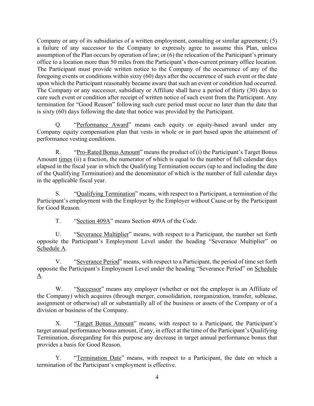4 Company or any of its subsidiaries of a written employment, consulting or similar agreement; (5) a failure of any successor to the Company to expressly agree to assume this Plan, unless assumption of the Plan occurs by operation of law; or (6) the relocation of the Participant’s primary office to a location more than 50 miles from the Participant’s then-current primary office location. The Participant must provide written notice to the Company of the occurrence of any of the foregoing events or conditions within sixty (60) days after the occurrence of such event or the date upon which the Participant reasonably became aware that such an event or condition had occurred. The Company or any successor, subsidiary or Affiliate shall have a period of thirty (30) days to cure such event or condition after receipt of written notice of such event from the Participant. Any termination for “Good Reason” following such cure period must occur no later than the date that is sixty (60) days following the date that notice was provided by the Participant. Q. “Performance Award” means each equity or equity-based award under any Company equity compensation plan that vests in whole or in part based upon the attainment of performance vesting conditions. R. “Pro-Rated Bonus Amount” means the product of (i) the Participant’s Target Bonus Amount times (ii) a fraction, the numerator of which is equal to the number of full calendar days elapsed in the fiscal year in which the Qualifying Termination occurs (up to and including the date of the Qualifying Termination) and the denominator of which is the number of full calendar days in the applicable fiscal year. S. “Qualifying Termination” means, with respect to a Participant, a termination of the Participant’s employment with the Employer by the Employer without Cause or by the Participant for Good Reason. T. “Section 409A” means Section 409A of the Code. U. “Severance Multiplier” means, with respect to a Participant, the number set forth opposite the Participant’s Employment Level under the heading “Severance Multiplier” on Schedule A. V. “Severance Period” means, with respect to a Participant, the period of time set forth opposite the Participant’s Employment Level under the heading “Severance Period” on Schedule A. W. “Successor” means any employer (whether or not the employer is an Affiliate of the Company) which acquires (through merger, consolidation, reorganization, transfer, sublease, assignment or otherwise) all or substantially all of the business or assets of the Company or of a division or business of the Company. X. “Target Bonus Amount” means, with respect to a Participant, the Participant’s target annual performance bonus amount, if any, in effect at the time of the Participant’s Qualifying Termination, disregarding for this purpose any decrease in target annual performance bonus that provides a basis for Good Reason. Y. “Termination Date” means, with respect to a Participant, the date on which a termination of the Participant’s employment is effective.