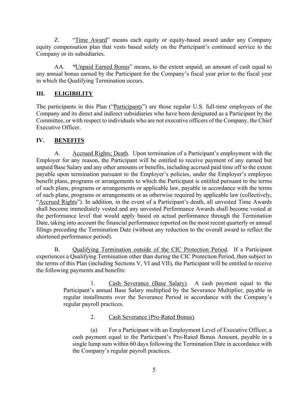 5 Z. “Time Award” means each equity or equity-based award under any Company equity compensation plan that vests based solely on the Participant’s continued service to the Company or its subsidiaries. AA. “Unpaid Earned Bonus” means, to the extent unpaid, an amount of cash equal to any annual bonus earned by the Participant for the Company’s fiscal year prior to the fiscal year in which the Qualifying Termination occurs. III. ELIGIBILITY The participants in this Plan (“Participants”) are those regular U.S. full-time employees of the Company and its direct and indirect subsidiaries who have been designated as a Participant by the Committee, or with respect to individuals who are not executive officers of the Company, the Chief Executive Officer. IV. BENEFITS A. Accrued Rights; Death. Upon termination of a Participant’s employment with the Employer for any reason, the Participant will be entitled to receive payment of any earned but unpaid Base Salary and any other amounts or benefits, including accrued paid time off to the extent payable upon termination pursuant to the Employer’s policies, under the Employer’s employee benefit plans, programs or arrangements to which the Participant is entitled pursuant to the terms of such plans, programs or arrangements or applicable law, payable in accordance with the terms of such plans, programs or arrangements or as otherwise required by applicable law (collectively, “Accrued Rights”). In addition, in the event of a Participant’s death, all unvested Time Awards shall become immediately vested and any unvested Performance Awards shall become vested at the performance level that would apply based on actual performance through the Termination Date, taking into account the financial performance reported on the most recent quarterly or annual filings preceding the Termination Date (without any reduction to the overall award to reflect the shortened performance period). B. Qualifying Termination outside of the CIC Protection Period. If a Participant experiences a Qualifying Termination other than during the CIC Protection Period, then subject to the terms of this Plan (including Sections V, VI and VII), the Participant will be entitled to receive the following payments and benefits: 1. Cash Severance (Base Salary). A cash payment equal to the Participant’s annual Base Salary multiplied by the Severance Multiplier, payable in regular installments over the Severance Period in accordance with the Company’s regular payroll practices. 2. Cash Severance (Pro-Rated Bonus). (a) For a Participant with an Employment Level of Executive Officer, a cash payment equal to the Participant’s Pro-Rated Bonus Amount, payable in a single lump sum within 60 days following the Termination Date in accordance with the Company’s regular payroll practices.