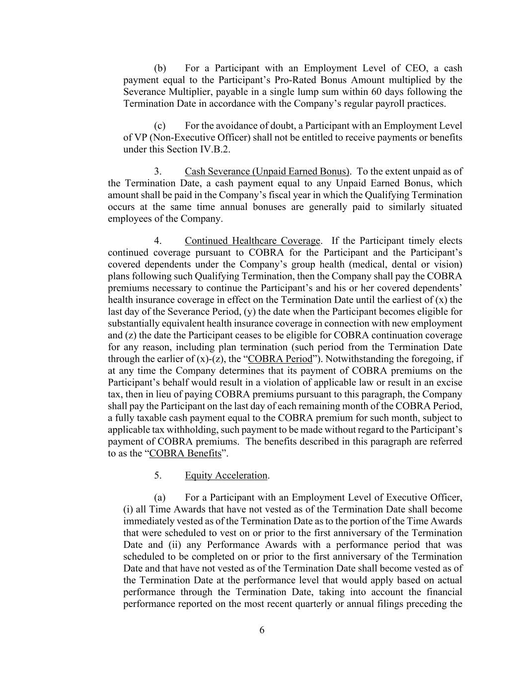 6 (b) For a Participant with an Employment Level of CEO, a cash payment equal to the Participant’s Pro-Rated Bonus Amount multiplied by the Severance Multiplier, payable in a single lump sum within 60 days following the Termination Date in accordance with the Company’s regular payroll practices. (c) For the avoidance of doubt, a Participant with an Employment Level of VP (Non-Executive Officer) shall not be entitled to receive payments or benefits under this Section IV.B.2. 3. Cash Severance (Unpaid Earned Bonus). To the extent unpaid as of the Termination Date, a cash payment equal to any Unpaid Earned Bonus, which amount shall be paid in the Company’s fiscal year in which the Qualifying Termination occurs at the same time annual bonuses are generally paid to similarly situated employees of the Company. 4. Continued Healthcare Coverage. If the Participant timely elects continued coverage pursuant to COBRA for the Participant and the Participant’s covered dependents under the Company’s group health (medical, dental or vision) plans following such Qualifying Termination, then the Company shall pay the COBRA premiums necessary to continue the Participant’s and his or her covered dependents’ health insurance coverage in effect on the Termination Date until the earliest of (x) the last day of the Severance Period, (y) the date when the Participant becomes eligible for substantially equivalent health insurance coverage in connection with new employment and (z) the date the Participant ceases to be eligible for COBRA continuation coverage for any reason, including plan termination (such period from the Termination Date through the earlier of (x)-(z), the “COBRA Period”). Notwithstanding the foregoing, if at any time the Company determines that its payment of COBRA premiums on the Participant’s behalf would result in a violation of applicable law or result in an excise tax, then in lieu of paying COBRA premiums pursuant to this paragraph, the Company shall pay the Participant on the last day of each remaining month of the COBRA Period, a fully taxable cash payment equal to the COBRA premium for such month, subject to applicable tax withholding, such payment to be made without regard to the Participant’s payment of COBRA premiums. The benefits described in this paragraph are referred to as the “COBRA Benefits”. 5. Equity Acceleration. (a) For a Participant with an Employment Level of Executive Officer, (i) all Time Awards that have not vested as of the Termination Date shall become immediately vested as of the Termination Date as to the portion of the Time Awards that were scheduled to vest on or prior to the first anniversary of the Termination Date and (ii) any Performance Awards with a performance period that was scheduled to be completed on or prior to the first anniversary of the Termination Date and that have not vested as of the Termination Date shall become vested as of the Termination Date at the performance level that would apply based on actual performance through the Termination Date, taking into account the financial performance reported on the most recent quarterly or annual filings preceding the