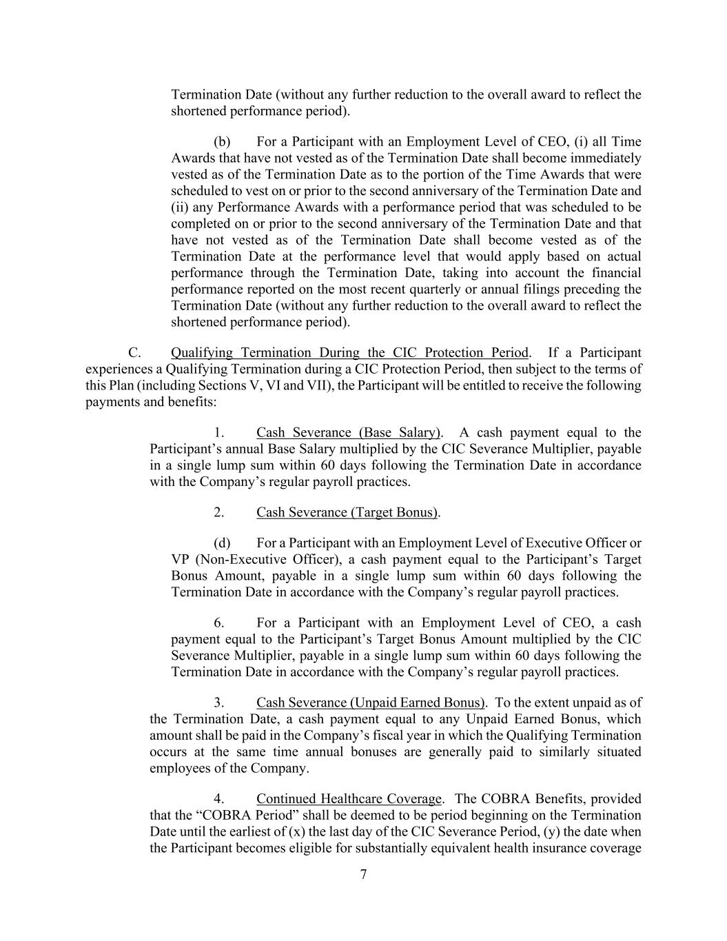7 Termination Date (without any further reduction to the overall award to reflect the shortened performance period). (b) For a Participant with an Employment Level of CEO, (i) all Time Awards that have not vested as of the Termination Date shall become immediately vested as of the Termination Date as to the portion of the Time Awards that were scheduled to vest on or prior to the second anniversary of the Termination Date and (ii) any Performance Awards with a performance period that was scheduled to be completed on or prior to the second anniversary of the Termination Date and that have not vested as of the Termination Date shall become vested as of the Termination Date at the performance level that would apply based on actual performance through the Termination Date, taking into account the financial performance reported on the most recent quarterly or annual filings preceding the Termination Date (without any further reduction to the overall award to reflect the shortened performance period). C. Qualifying Termination During the CIC Protection Period. If a Participant experiences a Qualifying Termination during a CIC Protection Period, then subject to the terms of this Plan (including Sections V, VI and VII), the Participant will be entitled to receive the following payments and benefits: 1. Cash Severance (Base Salary). A cash payment equal to the Participant’s annual Base Salary multiplied by the CIC Severance Multiplier, payable in a single lump sum within 60 days following the Termination Date in accordance with the Company’s regular payroll practices. 2. Cash Severance (Target Bonus). (d) For a Participant with an Employment Level of Executive Officer or VP (Non-Executive Officer), a cash payment equal to the Participant’s Target Bonus Amount, payable in a single lump sum within 60 days following the Termination Date in accordance with the Company’s regular payroll practices. 6. For a Participant with an Employment Level of CEO, a cash payment equal to the Participant’s Target Bonus Amount multiplied by the CIC Severance Multiplier, payable in a single lump sum within 60 days following the Termination Date in accordance with the Company’s regular payroll practices. 3. Cash Severance (Unpaid Earned Bonus). To the extent unpaid as of the Termination Date, a cash payment equal to any Unpaid Earned Bonus, which amount shall be paid in the Company’s fiscal year in which the Qualifying Termination occurs at the same time annual bonuses are generally paid to similarly situated employees of the Company. 4. Continued Healthcare Coverage. The COBRA Benefits, provided that the “COBRA Period” shall be deemed to be period beginning on the Termination Date until the earliest of (x) the last day of the CIC Severance Period, (y) the date when the Participant becomes eligible for substantially equivalent health insurance coverage
