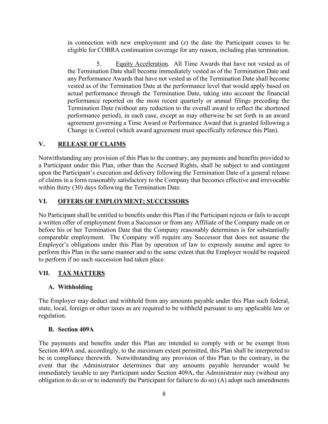 8 in connection with new employment and (z) the date the Participant ceases to be eligible for COBRA continuation coverage for any reason, including plan termination. 5. Equity Acceleration. All Time Awards that have not vested as of the Termination Date shall become immediately vested as of the Termination Date and any Performance Awards that have not vested as of the Termination Date shall become vested as of the Termination Date at the performance level that would apply based on actual performance through the Termination Date, taking into account the financial performance reported on the most recent quarterly or annual filings preceding the Termination Date (without any reduction to the overall award to reflect the shortened performance period), in each case, except as may otherwise be set forth in an award agreement governing a Time Award or Performance Award that is granted following a Change in Control (which award agreement must specifically reference this Plan). V. RELEASE OF CLAIMS Notwithstanding any provision of this Plan to the contrary, any payments and benefits provided to a Participant under this Plan, other than the Accrued Rights, shall be subject to and contingent upon the Participant’s execution and delivery following the Termination Date of a general release of claims in a form reasonably satisfactory to the Company that becomes effective and irrevocable within thirty (30) days following the Termination Date. VI. OFFERS OF EMPLOYMENT; SUCCESSORS No Participant shall be entitled to benefits under this Plan if the Participant rejects or fails to accept a written offer of employment from a Successor or from any Affiliate of the Company made on or before his or her Termination Date that the Company reasonably determines is for substantially comparable employment. The Company will require any Successor that does not assume the Employer’s obligations under this Plan by operation of law to expressly assume and agree to perform this Plan in the same manner and to the same extent that the Employer would be required to perform if no such succession had taken place. VII. TAX MATTERS A. Withholding The Employer may deduct and withhold from any amounts payable under this Plan such federal, state, local, foreign or other taxes as are required to be withheld pursuant to any applicable law or regulation. B. Section 409A The payments and benefits under this Plan are intended to comply with or be exempt from Section 409A and, accordingly, to the maximum extent permitted, this Plan shall be interpreted to be in compliance therewith. Notwithstanding any provision of this Plan to the contrary, in the event that the Administrator determines that any amounts payable hereunder would be immediately taxable to any Participant under Section 409A, the Administrator may (without any obligation to do so or to indemnify the Participant for failure to do so) (A) adopt such amendments