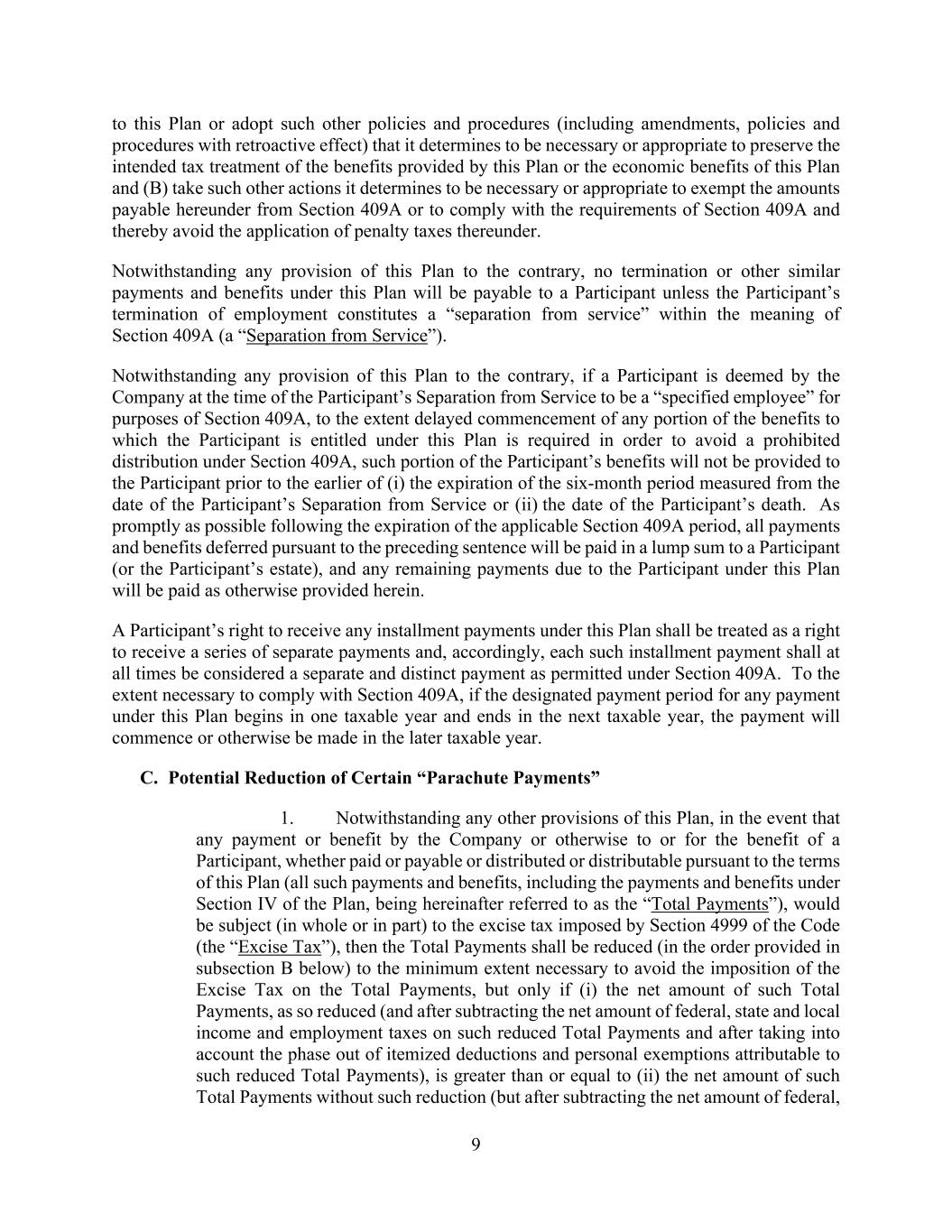 9 to this Plan or adopt such other policies and procedures (including amendments, policies and procedures with retroactive effect) that it determines to be necessary or appropriate to preserve the intended tax treatment of the benefits provided by this Plan or the economic benefits of this Plan and (B) take such other actions it determines to be necessary or appropriate to exempt the amounts payable hereunder from Section 409A or to comply with the requirements of Section 409A and thereby avoid the application of penalty taxes thereunder. Notwithstanding any provision of this Plan to the contrary, no termination or other similar payments and benefits under this Plan will be payable to a Participant unless the Participant’s termination of employment constitutes a “separation from service” within the meaning of Section 409A (a “Separation from Service”). Notwithstanding any provision of this Plan to the contrary, if a Participant is deemed by the Company at the time of the Participant’s Separation from Service to be a “specified employee” for purposes of Section 409A, to the extent delayed commencement of any portion of the benefits to which the Participant is entitled under this Plan is required in order to avoid a prohibited distribution under Section 409A, such portion of the Participant’s benefits will not be provided to the Participant prior to the earlier of (i) the expiration of the six-month period measured from the date of the Participant’s Separation from Service or (ii) the date of the Participant’s death. As promptly as possible following the expiration of the applicable Section 409A period, all payments and benefits deferred pursuant to the preceding sentence will be paid in a lump sum to a Participant (or the Participant’s estate), and any remaining payments due to the Participant under this Plan will be paid as otherwise provided herein. A Participant’s right to receive any installment payments under this Plan shall be treated as a right to receive a series of separate payments and, accordingly, each such installment payment shall at all times be considered a separate and distinct payment as permitted under Section 409A. To the extent necessary to comply with Section 409A, if the designated payment period for any payment under this Plan begins in one taxable year and ends in the next taxable year, the payment will commence or otherwise be made in the later taxable year. C. Potential Reduction of Certain “Parachute Payments” 1. Notwithstanding any other provisions of this Plan, in the event that any payment or benefit by the Company or otherwise to or for the benefit of a Participant, whether paid or payable or distributed or distributable pursuant to the terms of this Plan (all such payments and benefits, including the payments and benefits under Section IV of the Plan, being hereinafter referred to as the “Total Payments”), would be subject (in whole or in part) to the excise tax imposed by Section 4999 of the Code (the “Excise Tax”), then the Total Payments shall be reduced (in the order provided in subsection B below) to the minimum extent necessary to avoid the imposition of the Excise Tax on the Total Payments, but only if (i) the net amount of such Total Payments, as so reduced (and after subtracting the net amount of federal, state and local income and employment taxes on such reduced Total Payments and after taking into account the phase out of itemized deductions and personal exemptions attributable to such reduced Total Payments), is greater than or equal to (ii) the net amount of such Total Payments without such reduction (but after subtracting the net amount of federal,