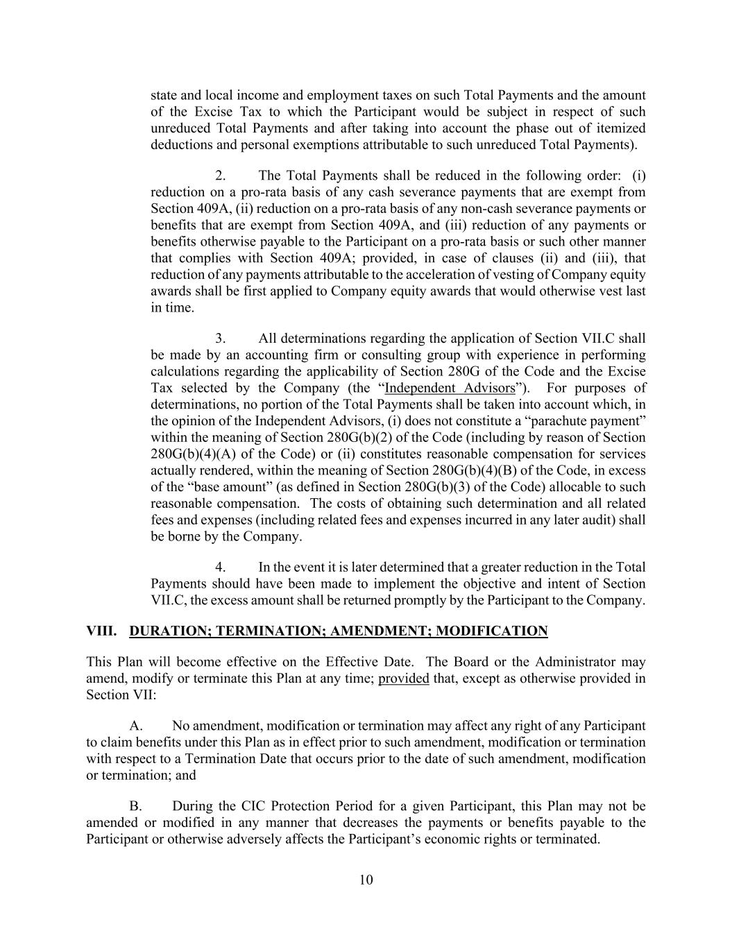 10 state and local income and employment taxes on such Total Payments and the amount of the Excise Tax to which the Participant would be subject in respect of such unreduced Total Payments and after taking into account the phase out of itemized deductions and personal exemptions attributable to such unreduced Total Payments). 2. The Total Payments shall be reduced in the following order: (i) reduction on a pro-rata basis of any cash severance payments that are exempt from Section 409A, (ii) reduction on a pro-rata basis of any non-cash severance payments or benefits that are exempt from Section 409A, and (iii) reduction of any payments or benefits otherwise payable to the Participant on a pro-rata basis or such other manner that complies with Section 409A; provided, in case of clauses (ii) and (iii), that reduction of any payments attributable to the acceleration of vesting of Company equity awards shall be first applied to Company equity awards that would otherwise vest last in time. 3. All determinations regarding the application of Section VII.C shall be made by an accounting firm or consulting group with experience in performing calculations regarding the applicability of Section 280G of the Code and the Excise Tax selected by the Company (the “Independent Advisors”). For purposes of determinations, no portion of the Total Payments shall be taken into account which, in the opinion of the Independent Advisors, (i) does not constitute a “parachute payment” within the meaning of Section 280G(b)(2) of the Code (including by reason of Section 280G(b)(4)(A) of the Code) or (ii) constitutes reasonable compensation for services actually rendered, within the meaning of Section 280G(b)(4)(B) of the Code, in excess of the “base amount” (as defined in Section 280G(b)(3) of the Code) allocable to such reasonable compensation. The costs of obtaining such determination and all related fees and expenses (including related fees and expenses incurred in any later audit) shall be borne by the Company. 4. In the event it is later determined that a greater reduction in the Total Payments should have been made to implement the objective and intent of Section VII.C, the excess amount shall be returned promptly by the Participant to the Company. VIII. DURATION; TERMINATION; AMENDMENT; MODIFICATION This Plan will become effective on the Effective Date. The Board or the Administrator may amend, modify or terminate this Plan at any time; provided that, except as otherwise provided in Section VII: A. No amendment, modification or termination may affect any right of any Participant to claim benefits under this Plan as in effect prior to such amendment, modification or termination with respect to a Termination Date that occurs prior to the date of such amendment, modification or termination; and B. During the CIC Protection Period for a given Participant, this Plan may not be amended or modified in any manner that decreases the payments or benefits payable to the Participant or otherwise adversely affects the Participant’s economic rights or terminated.