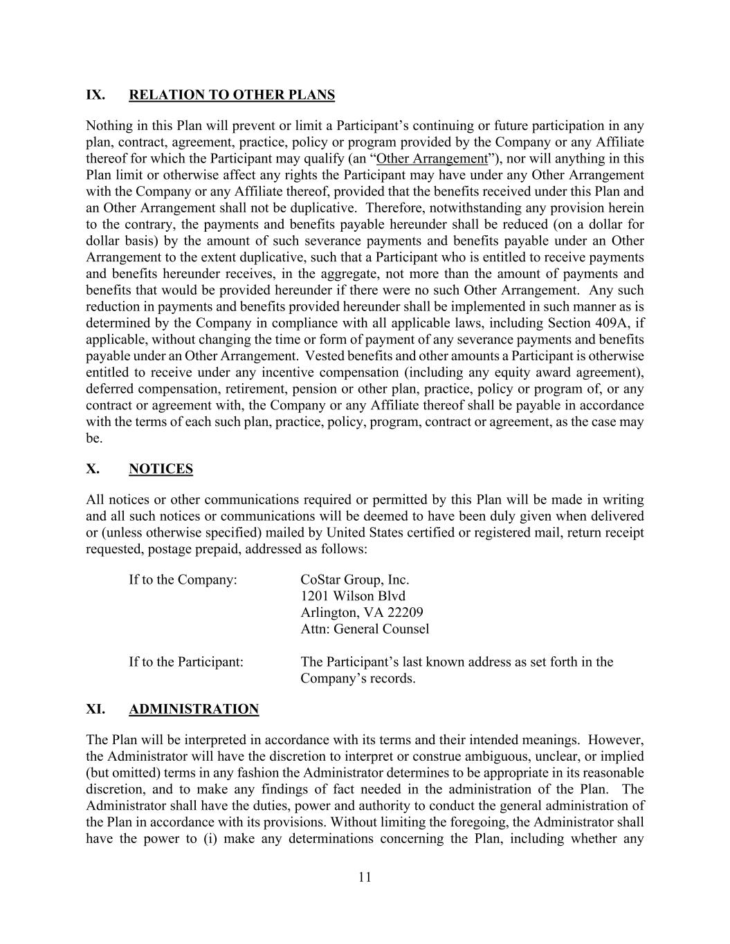 11 IX. RELATION TO OTHER PLANS Nothing in this Plan will prevent or limit a Participant’s continuing or future participation in any plan, contract, agreement, practice, policy or program provided by the Company or any Affiliate thereof for which the Participant may qualify (an “Other Arrangement”), nor will anything in this Plan limit or otherwise affect any rights the Participant may have under any Other Arrangement with the Company or any Affiliate thereof, provided that the benefits received under this Plan and an Other Arrangement shall not be duplicative. Therefore, notwithstanding any provision herein to the contrary, the payments and benefits payable hereunder shall be reduced (on a dollar for dollar basis) by the amount of such severance payments and benefits payable under an Other Arrangement to the extent duplicative, such that a Participant who is entitled to receive payments and benefits hereunder receives, in the aggregate, not more than the amount of payments and benefits that would be provided hereunder if there were no such Other Arrangement. Any such reduction in payments and benefits provided hereunder shall be implemented in such manner as is determined by the Company in compliance with all applicable laws, including Section 409A, if applicable, without changing the time or form of payment of any severance payments and benefits payable under an Other Arrangement. Vested benefits and other amounts a Participant is otherwise entitled to receive under any incentive compensation (including any equity award agreement), deferred compensation, retirement, pension or other plan, practice, policy or program of, or any contract or agreement with, the Company or any Affiliate thereof shall be payable in accordance with the terms of each such plan, practice, policy, program, contract or agreement, as the case may be. X. NOTICES All notices or other communications required or permitted by this Plan will be made in writing and all such notices or communications will be deemed to have been duly given when delivered or (unless otherwise specified) mailed by United States certified or registered mail, return receipt requested, postage prepaid, addressed as follows: If to the Company: CoStar Group, Inc. 1201 Wilson Blvd Arlington, VA 22209 Attn: General Counsel If to the Participant: The Participant’s last known address as set forth in the Company’s records. XI. ADMINISTRATION The Plan will be interpreted in accordance with its terms and their intended meanings. However, the Administrator will have the discretion to interpret or construe ambiguous, unclear, or implied (but omitted) terms in any fashion the Administrator determines to be appropriate in its reasonable discretion, and to make any findings of fact needed in the administration of the Plan. The Administrator shall have the duties, power and authority to conduct the general administration of the Plan in accordance with its provisions. Without limiting the foregoing, the Administrator shall have the power to (i) make any determinations concerning the Plan, including whether any
