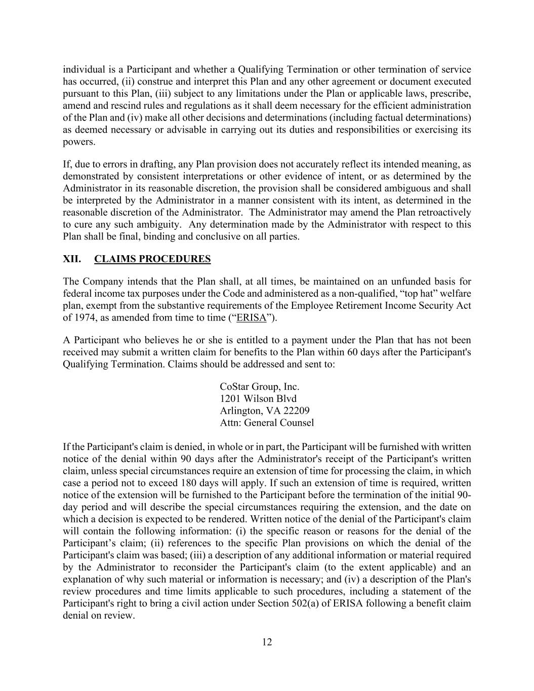 12 individual is a Participant and whether a Qualifying Termination or other termination of service has occurred, (ii) construe and interpret this Plan and any other agreement or document executed pursuant to this Plan, (iii) subject to any limitations under the Plan or applicable laws, prescribe, amend and rescind rules and regulations as it shall deem necessary for the efficient administration of the Plan and (iv) make all other decisions and determinations (including factual determinations) as deemed necessary or advisable in carrying out its duties and responsibilities or exercising its powers. If, due to errors in drafting, any Plan provision does not accurately reflect its intended meaning, as demonstrated by consistent interpretations or other evidence of intent, or as determined by the Administrator in its reasonable discretion, the provision shall be considered ambiguous and shall be interpreted by the Administrator in a manner consistent with its intent, as determined in the reasonable discretion of the Administrator. The Administrator may amend the Plan retroactively to cure any such ambiguity. Any determination made by the Administrator with respect to this Plan shall be final, binding and conclusive on all parties. XII. CLAIMS PROCEDURES The Company intends that the Plan shall, at all times, be maintained on an unfunded basis for federal income tax purposes under the Code and administered as a non-qualified, “top hat” welfare plan, exempt from the substantive requirements of the Employee Retirement Income Security Act of 1974, as amended from time to time (“ERISA”). A Participant who believes he or she is entitled to a payment under the Plan that has not been received may submit a written claim for benefits to the Plan within 60 days after the Participant's Qualifying Termination. Claims should be addressed and sent to: CoStar Group, Inc. 1201 Wilson Blvd Arlington, VA 22209 Attn: General Counsel If the Participant's claim is denied, in whole or in part, the Participant will be furnished with written notice of the denial within 90 days after the Administrator's receipt of the Participant's written claim, unless special circumstances require an extension of time for processing the claim, in which case a period not to exceed 180 days will apply. If such an extension of time is required, written notice of the extension will be furnished to the Participant before the termination of the initial 90- day period and will describe the special circumstances requiring the extension, and the date on which a decision is expected to be rendered. Written notice of the denial of the Participant's claim will contain the following information: (i) the specific reason or reasons for the denial of the Participant’s claim; (ii) references to the specific Plan provisions on which the denial of the Participant's claim was based; (iii) a description of any additional information or material required by the Administrator to reconsider the Participant's claim (to the extent applicable) and an explanation of why such material or information is necessary; and (iv) a description of the Plan's review procedures and time limits applicable to such procedures, including a statement of the Participant's right to bring a civil action under Section 502(a) of ERISA following a benefit claim denial on review.