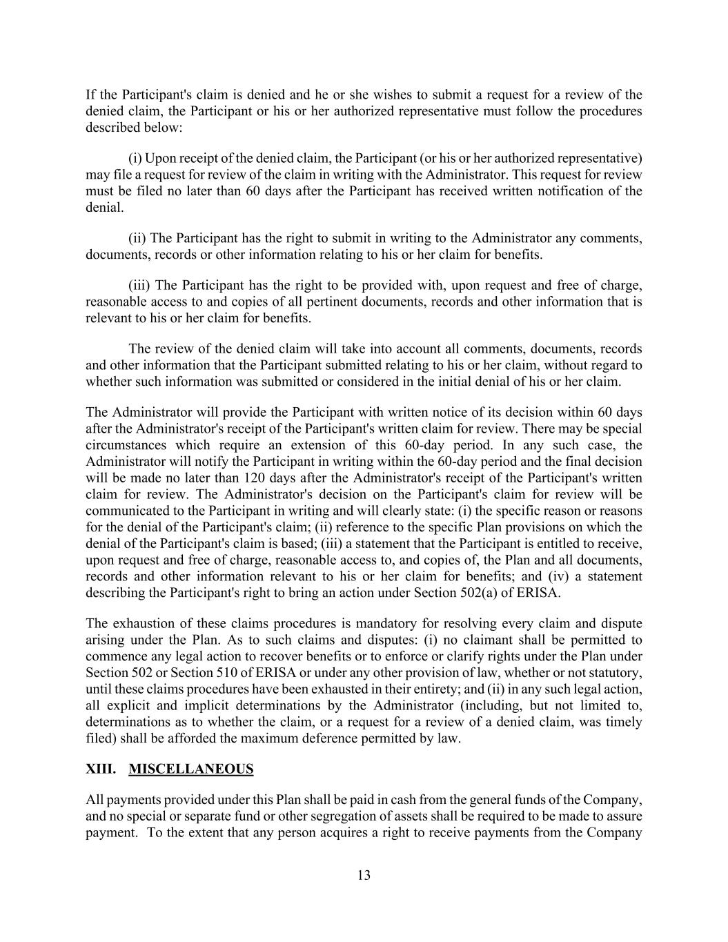 13 If the Participant's claim is denied and he or she wishes to submit a request for a review of the denied claim, the Participant or his or her authorized representative must follow the procedures described below: (i) Upon receipt of the denied claim, the Participant (or his or her authorized representative) may file a request for review of the claim in writing with the Administrator. This request for review must be filed no later than 60 days after the Participant has received written notification of the denial. (ii) The Participant has the right to submit in writing to the Administrator any comments, documents, records or other information relating to his or her claim for benefits. (iii) The Participant has the right to be provided with, upon request and free of charge, reasonable access to and copies of all pertinent documents, records and other information that is relevant to his or her claim for benefits. The review of the denied claim will take into account all comments, documents, records and other information that the Participant submitted relating to his or her claim, without regard to whether such information was submitted or considered in the initial denial of his or her claim. The Administrator will provide the Participant with written notice of its decision within 60 days after the Administrator's receipt of the Participant's written claim for review. There may be special circumstances which require an extension of this 60-day period. In any such case, the Administrator will notify the Participant in writing within the 60-day period and the final decision will be made no later than 120 days after the Administrator's receipt of the Participant's written claim for review. The Administrator's decision on the Participant's claim for review will be communicated to the Participant in writing and will clearly state: (i) the specific reason or reasons for the denial of the Participant's claim; (ii) reference to the specific Plan provisions on which the denial of the Participant's claim is based; (iii) a statement that the Participant is entitled to receive, upon request and free of charge, reasonable access to, and copies of, the Plan and all documents, records and other information relevant to his or her claim for benefits; and (iv) a statement describing the Participant's right to bring an action under Section 502(a) of ERISA. The exhaustion of these claims procedures is mandatory for resolving every claim and dispute arising under the Plan. As to such claims and disputes: (i) no claimant shall be permitted to commence any legal action to recover benefits or to enforce or clarify rights under the Plan under Section 502 or Section 510 of ERISA or under any other provision of law, whether or not statutory, until these claims procedures have been exhausted in their entirety; and (ii) in any such legal action, all explicit and implicit determinations by the Administrator (including, but not limited to, determinations as to whether the claim, or a request for a review of a denied claim, was timely filed) shall be afforded the maximum deference permitted by law. XIII. MISCELLANEOUS All payments provided under this Plan shall be paid in cash from the general funds of the Company, and no special or separate fund or other segregation of assets shall be required to be made to assure payment. To the extent that any person acquires a right to receive payments from the Company