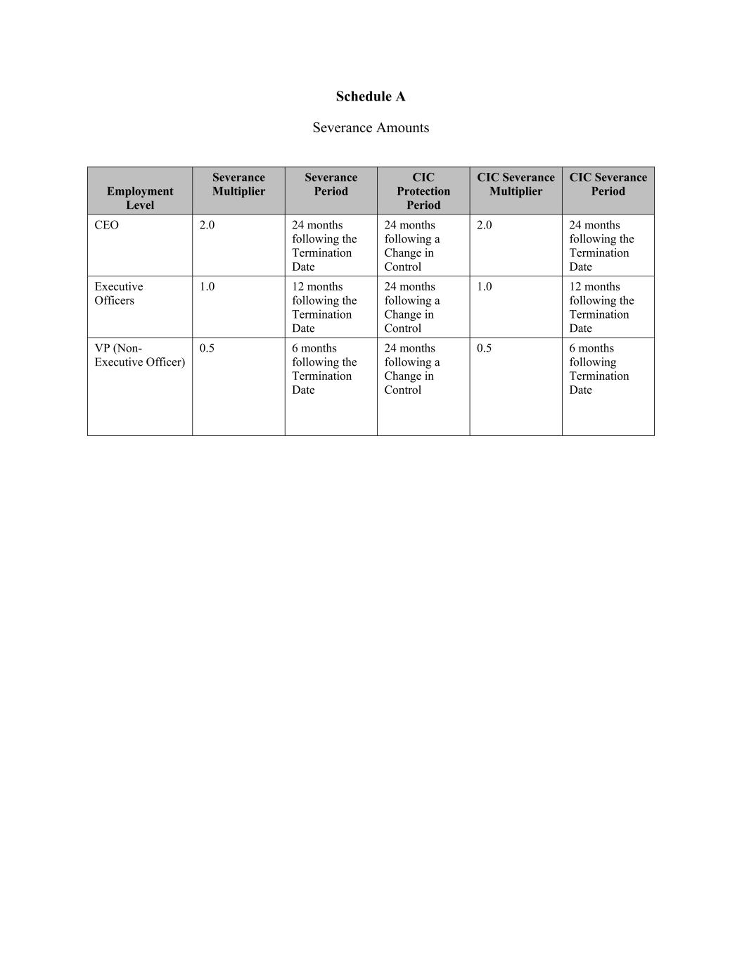 Schedule A Severance Amounts Employment Level Severance Multiplier Severance Period CIC Protection Period CIC Severance Multiplier CIC Severance Period CEO 2.0 24 months following the Termination Date 24 months following a Change in Control 2.0 24 months following the Termination Date Executive Officers 1.0 12 months following the Termination Date 24 months following a Change in Control 1.0 12 months following the Termination Date VP (Non- Executive Officer) 0.5 6 months following the Termination Date 24 months following a Change in Control 0.5 6 months following Termination Date