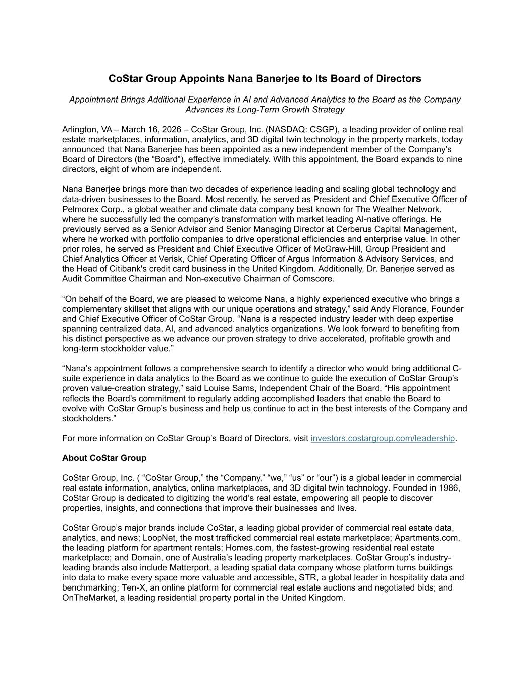 CoStar Group Appoints Nana Banerjee to Its Board of Directors Appointment Brings Additional Experience in AI and Advanced Analytics to the Board as the Company Advances its Long-Term Growth Strategy Arlington, VA – March 16, 2026 – CoStar Group, Inc. (NASDAQ: CSGP), a leading provider of online real estate marketplaces, information, analytics, and 3D digital twin technology in the property markets, today announced that Nana Banerjee has been appointed as a new independent member of the Company’s Board of Directors (the “Board”), effective immediately. With this appointment, the Board expands to nine directors, eight of whom are independent. Nana Banerjee brings more than two decades of experience leading and scaling global technology and data-driven businesses to the Board. Most recently, he served as President and Chief Executive Officer of Pelmorex Corp., a global weather and climate data company best known for The Weather Network, where he successfully led the company’s transformation with market leading AI-native offerings. He previously served as a Senior Advisor and Senior Managing Director at Cerberus Capital Management, where he worked with portfolio companies to drive operational efficiencies and enterprise value. In other prior roles, he served as President and Chief Executive Officer of McGraw-Hill, Group President and Chief Analytics Officer at Verisk, Chief Operating Officer of Argus Information & Advisory Services, and the Head of Citibank's credit card business in the United Kingdom. Additionally, Dr. Banerjee served as Audit Committee Chairman and Non-executive Chairman of Comscore. “On behalf of the Board, we are pleased to welcome Nana, a highly experienced executive who brings a complementary skillset that aligns with our unique operations and strategy,” said Andy Florance, Founder and Chief Executive Officer of CoStar Group. “Nana is a respected industry leader with deep expertise spanning centralized data, AI, and advanced analytics organizations. We look forward to benefiting from his distinct perspective as we advance our proven strategy to drive accelerated, profitable growth and long-term stockholder value.” “Nana’s appointment follows a comprehensive search to identify a director who would bring additional C- suite experience in data analytics to the Board as we continue to guide the execution of CoStar Group’s proven value-creation strategy,” said Louise Sams, Independent Chair of the Board. “His appointment reflects the Board’s commitment to regularly adding accomplished leaders that enable the Board to evolve with CoStar Group’s business and help us continue to act in the best interests of the Company and stockholders.” For more information on CoStar Group’s Board of Directors, visit investors.costargroup.com/leadership. About CoStar Group CoStar Group, Inc. ( “CoStar Group,” the “Company,” “we,” “us” or “our”) is a global leader in commercial real estate information, analytics, online marketplaces, and 3D digital twin technology. Founded in 1986, CoStar Group is dedicated to digitizing the world’s real estate, empowering all people to discover properties, insights, and connections that improve their businesses and lives. CoStar Group’s major brands include CoStar, a leading global provider of commercial real estate data, analytics, and news; LoopNet, the most trafficked commercial real estate marketplace; Apartments.com, the leading platform for apartment rentals; Homes.com, the fastest-growing residential real estate marketplace; and Domain, one of Australia’s leading property marketplaces. CoStar Group’s industry- leading brands also include Matterport, a leading spatial data company whose platform turns buildings into data to make every space more valuable and accessible, STR, a global leader in hospitality data and benchmarking; Ten-X, an online platform for commercial real estate auctions and negotiated bids; and OnTheMarket, a leading residential property portal in the United Kingdom.