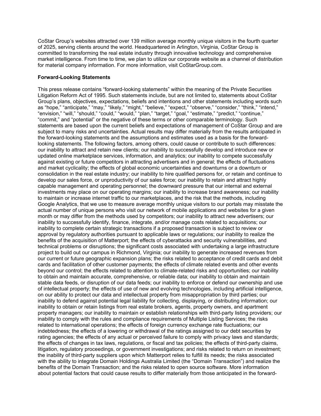 CoStar Group’s websites attracted over 139 million average monthly unique visitors in the fourth quarter of 2025, serving clients around the world. Headquartered in Arlington, Virginia, CoStar Group is committed to transforming the real estate industry through innovative technology and comprehensive market intelligence. From time to time, we plan to utilize our corporate website as a channel of distribution for material company information. For more information, visit CoStarGroup.com. Forward-Looking Statements This press release contains “forward-looking statements” within the meaning of the Private Securities Litigation Reform Act of 1995. Such statements include, but are not limited to, statements about CoStar Group’s plans, objectives, expectations, beliefs and intentions and other statements including words such as “hope,” “anticipate,” “may,” “likely,” “might,” “believe,” “expect,” “observe,” “consider,” “think,” “intend,” “envision,” “will,” “should,” “could,” “would,” “plan,” “target,” “goal,” “estimate,” “predict,” “continue,” “commit,” and “potential” or the negative of these terms or other comparable terminology. Such statements are based upon the current beliefs and expectations of management of CoStar Group and are subject to many risks and uncertainties. Actual results may differ materially from the results anticipated in the forward-looking statements and the assumptions and estimates used as a basis for the forward- looking statements. The following factors, among others, could cause or contribute to such differences: our inability to attract and retain new clients; our inability to successfully develop and introduce new or updated online marketplace services, information, and analytics; our inability to compete successfully against existing or future competitors in attracting advertisers and in general; the effects of fluctuations and market cyclicality; the effects of global economic uncertainties and downturns or a downturn or consolidation in the real estate industry; our inability to hire qualified persons for, or retain and continue to develop our sales force, or unproductivity of our sales force; our inability to retain and attract highly capable management and operating personnel; the downward pressure that our internal and external investments may place on our operating margins; our inability to increase brand awareness; our inability to maintain or increase internet traffic to our marketplaces, and the risk that the methods, including Google Analytics, that we use to measure average monthly unique visitors to our portals may misstate the actual number of unique persons who visit our network of mobile applications and websites for a given month or may differ from the methods used by competitors; our inability to attract new advertisers; our inability to successfully identify, finance, integrate, and/or manage costs related to acquisitions; our inability to complete certain strategic transactions if a proposed transaction is subject to review or approval by regulatory authorities pursuant to applicable laws or regulations; our inability to realize the benefits of the acquisition of Matterport; the effects of cyberattacks and security vulnerabilities, and technical problems or disruptions; the significant costs associated with undertaking a large infrastructure project to build out our campus in Richmond, Virginia; our inability to generate increased revenues from our current or future geographic expansion plans; the risks related to acceptance of credit cards and debit cards and facilitation of other customer payments; the effects of climate related events and other events beyond our control; the effects related to attention to climate-related risks and opportunities; our inability to obtain and maintain accurate, comprehensive, or reliable data; our inability to obtain and maintain stable data feeds, or disruption of our data feeds; our inability to enforce or defend our ownership and use of intellectual property; the effects of use of new and evolving technologies, including artificial intelligence, on our ability to protect our data and intellectual property from misappropriation by third parties; our inability to defend against potential legal liability for collecting, displaying, or distributing information; our inability to obtain or retain listings from real estate brokers, agents, property owners, and apartment property managers; our inability to maintain or establish relationships with third-party listing providers; our inability to comply with the rules and compliance requirements of Multiple Listing Services; the risks related to international operations; the effects of foreign currency exchange rate fluctuations; our indebtedness; the effects of a lowering or withdrawal of the ratings assigned to our debt securities by rating agencies; the effects of any actual or perceived failure to comply with privacy laws and standards; the effects of changes in tax laws, regulations, or fiscal and tax policies; the effects of third-party claims, litigation, regulatory proceedings, or government investigations; and risks related to return on investment; the inability of third-party suppliers upon which Matterport relies to fulfill its needs; the risks associated with the ability to integrate Domain Holdings Australia Limited (the “Domain Transaction”) and realize the benefits of the Domain Transaction; and the risks related to open source software. More information about potential factors that could cause results to differ materially from those anticipated in the forward-