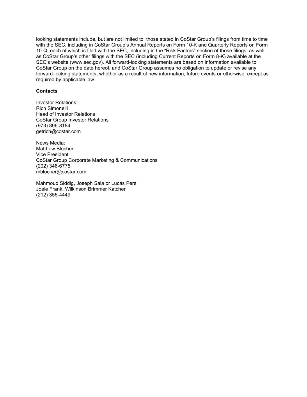looking statements include, but are not limited to, those stated in CoStar Group’s filings from time to time with the SEC, including in CoStar Group’s Annual Reports on Form 10-K and Quarterly Reports on Form 10-Q, each of which is filed with the SEC, including in the “Risk Factors” section of those filings, as well as CoStar Group’s other filings with the SEC (including Current Reports on Form 8-K) available at the SEC’s website (www.sec.gov). All forward-looking statements are based on information available to CoStar Group on the date hereof, and CoStar Group assumes no obligation to update or revise any forward-looking statements, whether as a result of new information, future events or otherwise, except as required by applicable law. Contacts Investor Relations: Rich Simonelli Head of Investor Relations CoStar Group Investor Relations (973) 896-8184 getrich@costar.com News Media: Matthew Blocher Vice President CoStar Group Corporate Marketing & Communications (202) 346-6775 mblocher@costar.com Mahmoud Siddig, Joseph Sala or Lucas Pers Joele Frank, Wilkinson Brimmer Katcher (212) 355-4449