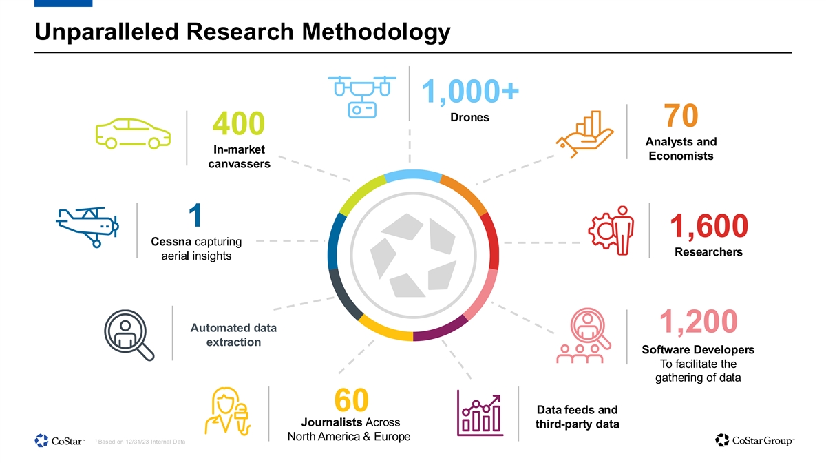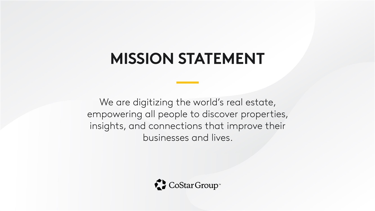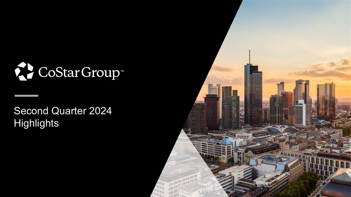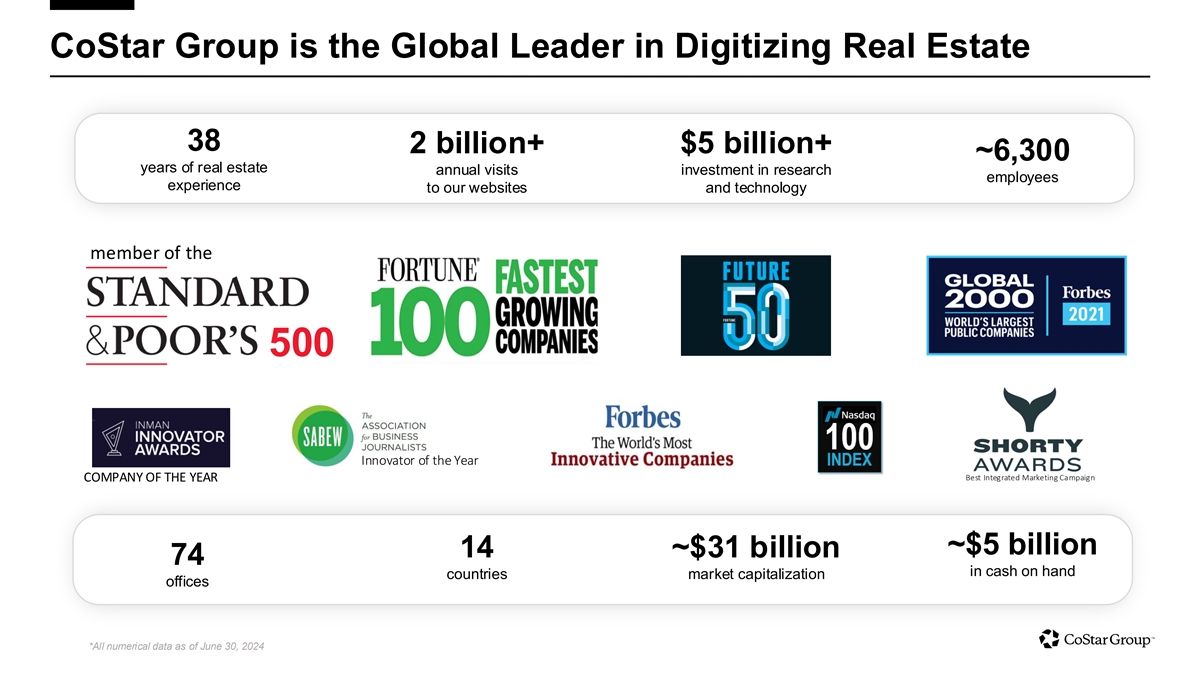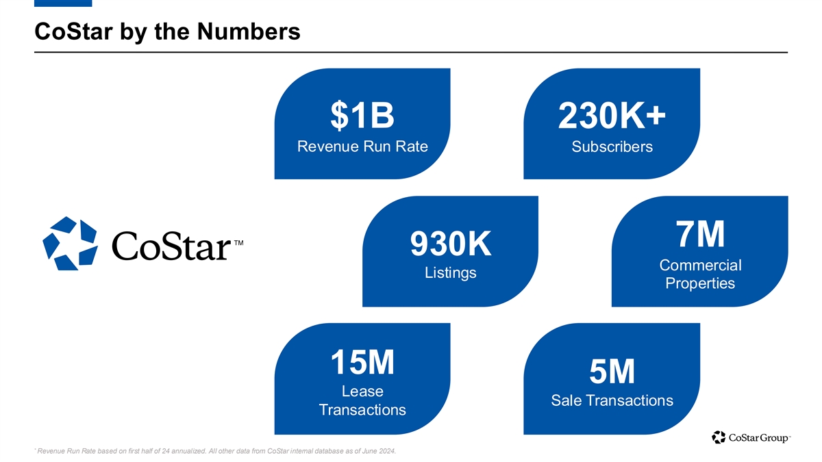 CoStar by the Numbers $1B 230K+ Revenue Run Rate Subscribers 7M 930K Commercial Listings Properties 15M 5M Lease Sale Transactions Transactions * Revenue Run Rate based on first half of 24 annualized. All other data from CoStar internal database as of June 2024.