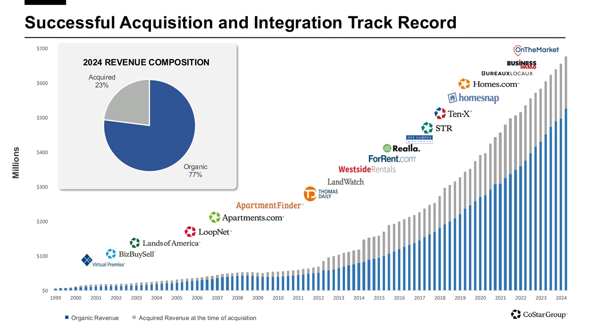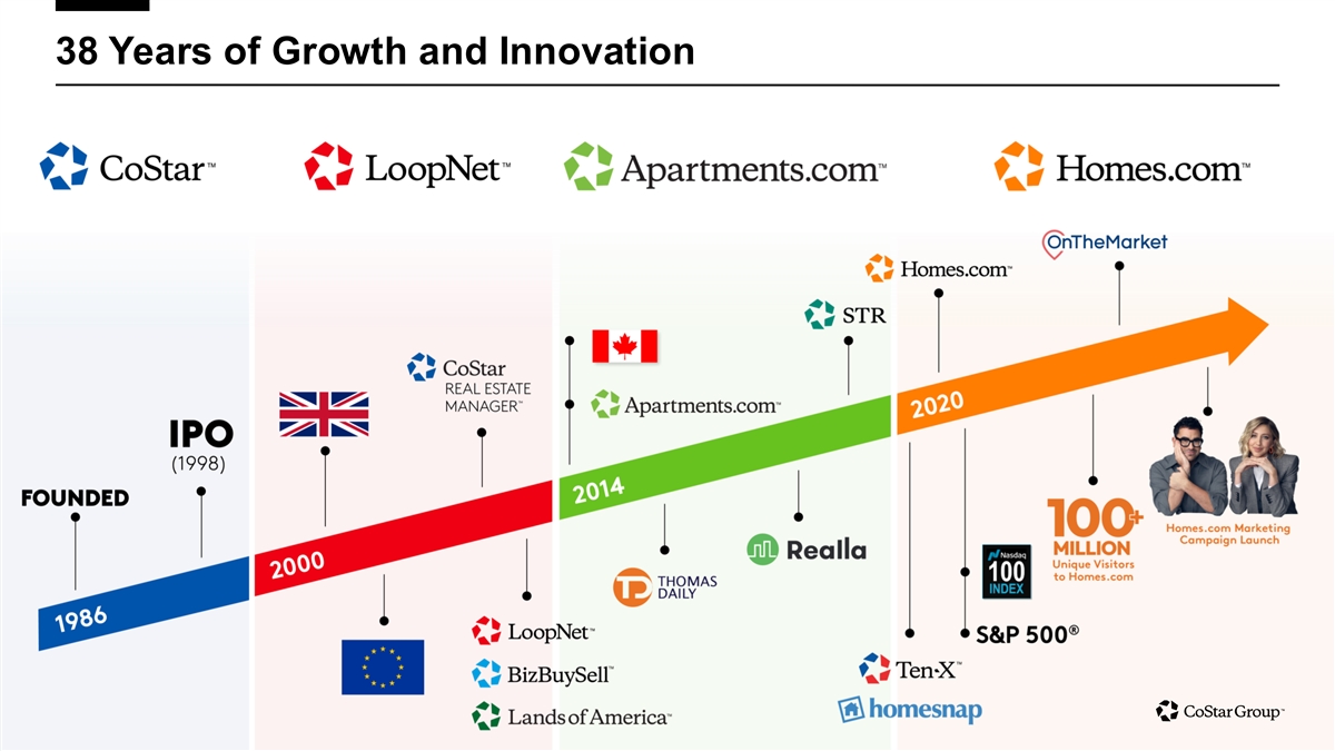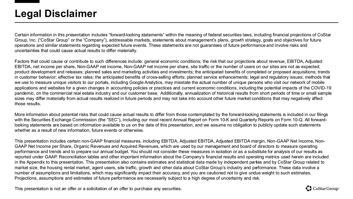 Legal Disclaimer Certain information in this presentation includes “forward-looking statements” within the meaning of federal securities laws, including financial projections of CoStar Group, Inc. (“CoStar Group” or the “Company”), addressable markets, statements about management’s plans, growth strategy, goals and objectives for future operations and similar statements regarding expected future events. These statements are not guarantees of future performance and involve risks and uncertainties that could cause actual results to differ materially. Factors that could cause or contribute to such differences include: general economic conditions; the risk that our projections about revenue, EBITDA, Adjusted EBITDA, net income per share, Non-GAAP net income, Non-GAAP net income per share, site traffic or the number of users on our sites are not as expected; product development and releases; planned sales and marketing activities and investments; the anticipated benefits of completed or proposed acquisitions; trends in customer behavior; effective tax rates; the anticipated benefits of cross-selling efforts; planned service enhancements; legal and regulatory issues; methods that we use to measure unique visitors to our portals, including Google Analytics, may misstate the actual number of unique persons who visit our network of mobile applications and websites for a given changes in accounting policies or practices and current economic conditions, including the potential impacts of the COVID-19 pandemic, on the commercial real estate industry and our customer base. Additionally, annualization of historical results from short periods of time or small sample sizes may differ materially from actual results realized in future periods and may not take into account other future market conditions that may negatively affect those results. More information about potential risks that could cause actual results to differ from those contemplated by the forward-looking statements is included in our filings with the Securities Exchange Commission (the “SEC”), including our most recent Annual Report on Form 10-K and Quarterly Reports on Form 10-Q. All forward- looking statements are based on information available to us on the date of this presentation, and we assume no obligation to publicly update such statements whether as a result of new information, future events or otherwise. This presentation includes certain non-GAAP financial measures, including EBITDA, Adjusted EBITDA, Adjusted EBITDA margin, Non-GAAP Net Income, Non- GAAP Net Income per Share, Organic Revenues and Acquired Revenues, which are used by our management and board of directors to measure operating performance and trends and to prepare our annual budget. You should not consider these measures in isolation or as a substitute for analysis of our results as reported under GAAP. Reconciliation tables and other important information about the Company’s financial results and operating metrics used herein are included in the Appendix to this presentation. This presentation also contains estimates and statistical data made by independent parties and by CoStar Group related to market size, the housing rental market, agent users, site traffic, growth and other data about CoStar Group’s industry and performance. These data involve a number of assumptions and limitations, which may significantly impact their accuracy, and you are cautioned not to give undue weight to such estimates. Projections, assumptions and estimates of future performance are necessarily subject to a high degree of uncertainty and risk. This presentation is not an offer or a solicitation of an offer to purchase any securities.