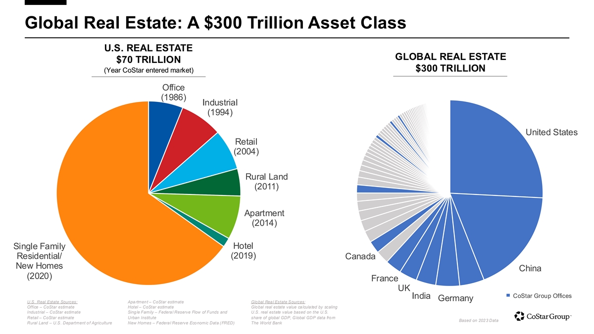 Global Real Estate: A $300 Trillion Asset Class U.S. REAL ESTATE GLOBAL REAL ESTATE $70 TRILLION $300 TRILLION (Year CoStar entered market) Office (1986) Industrial (1994) United States Retail (2004) Rural Land (2011) Apartment (2014) Hotel Single Family (2019) Residential/ Canada New Homes China (2020) France UK CoStar Group Offices India Germany U.S. Real Estate Sources: Apartment – CoStar estimate Global Real Estate Sources: Office – CoStar estimate Hotel – CoStar estimate Global real estate value calculated by scaling Industrial – CoStar estimate Single Family – Federal Reserve Flow of Funds and U.S. real estate value based on the U.S. Retail – CoStar estimate Urban Institute share of global GDP, Global GDP data from Based on 2023 Data Rural Land – U.S. Department of Agriculture New Homes – Federal Reserve Economic Data (FRED) The World Bank