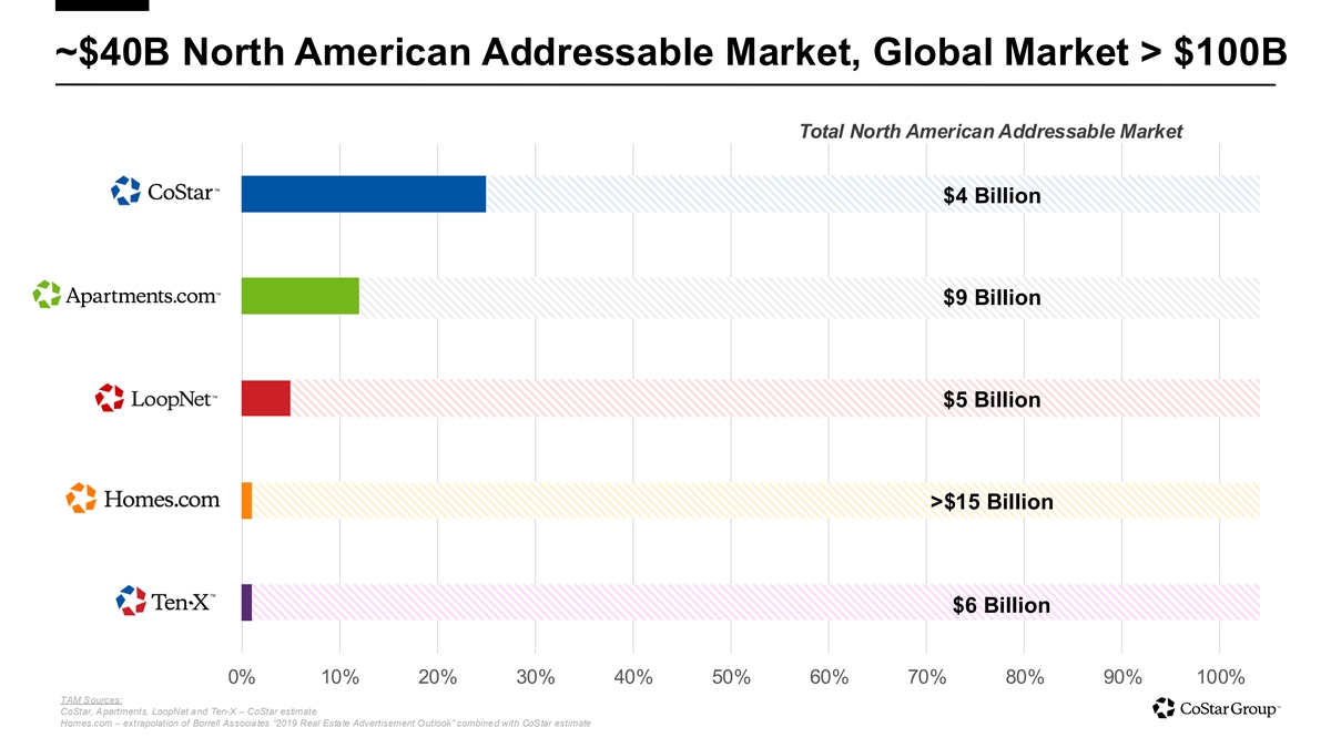~$40B North American Addressable Market, Global Market > $100B Total North American Addressable Market $4 Billion $9 Billion $5 Billion >$15 Billion $6 Billion 0% 10% 20% 30% 40% 50% 60% 70% 80% 90% 100% TAM Sources: CoStar, Apartments, LoopNet and Ten-X – CoStar estimate Homes.com – extrapolation of Borrell Associates “2019 Real Estate Advertisement Outlook” combined with CoStar estimate