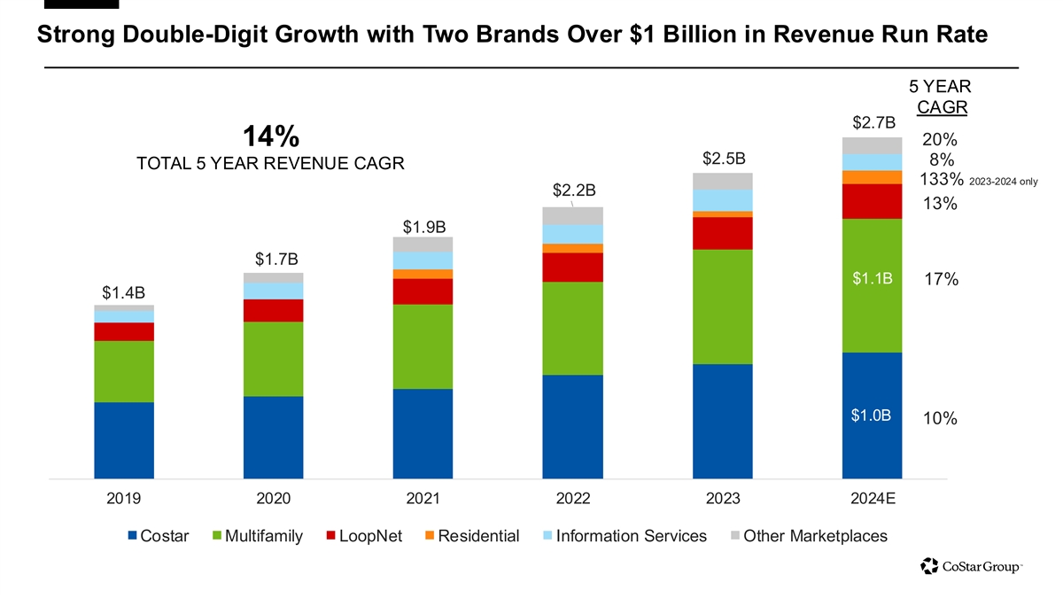 Strong Double-Digit Growth with Two Brands Over $1 Billion in Revenue Run Rate 5 YEAR CAGR $2.7B 20% 14% $2.5B 8% TOTAL 5 YEAR REVENUE CAGR 133% 2023-2024 only $2.2B 13% $1.9B $1.7B $1.1B 17% $1.4B $1.0B 10% 2019 2020 2021 2022 2023 2024E Costar Multifamily LoopNet Residential Information Services Other Marketplaces
