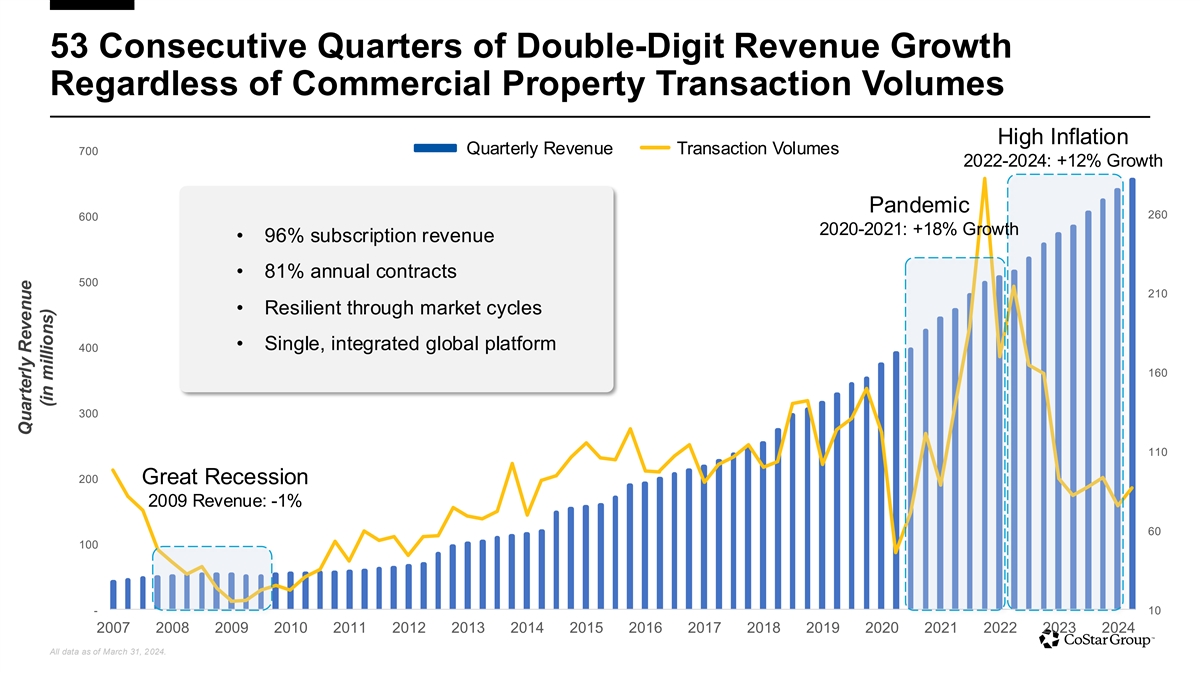 53 Consecutive Quarters of Double-Digit Revenue Growth Regardless of Commercial Property Transaction Volumes High Inflation 700 Quarterly Revenue Transaction Volumes 2022-2024: +12% Growth Pandemic 260 600 2020-2021: +18% Growth • 96% subscription revenue • 81% annual contracts 500 210 • Resilient through market cycles • Single, integrated global platform 400 160 300 110 200 Great Recession 2009 Revenue: -1% 60 100 - 10 2007 2008 2009 2010 2011 2012 2013 2014 2015 2016 2017 2018 2019 2020 2021 2022 2023 2024 All data as of March 31, 2024. Quarterly Revenue (in millions)
