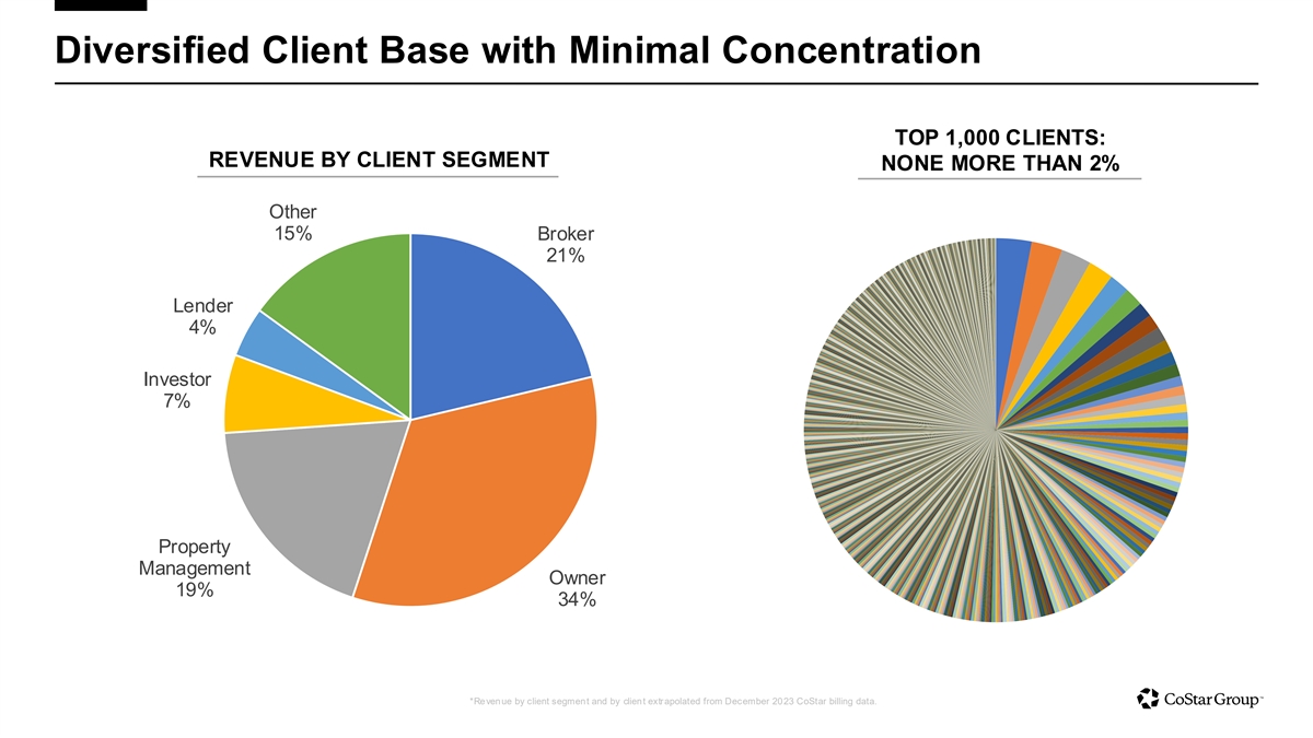 Diversified Client Base with Minimal Concentration TOP 1,000 CLIENTS: REVENUE BY CLIENT SEGMENT NONE MORE THAN 2% Other 15% Broker 21% Lender 4% Investor 7% Property Management Owner 19% 34% *Revenue by client segment and by client extrapolated from December 2023 CoStar billing data.