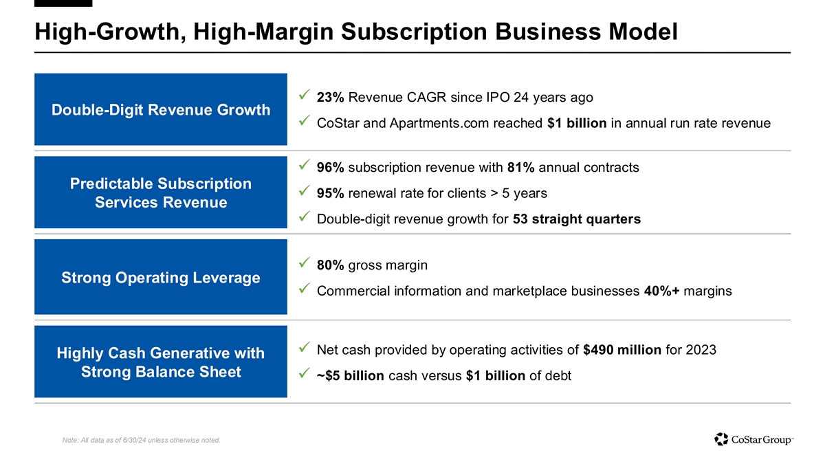 High-Growth, High-Margin Subscription Business Model ✓ 23% Revenue CAGR since IPO 24 years ago Double-Digit Revenue Growth ✓ CoStar and Apartments.com reached $1 billion in annual run rate revenue ✓ 96% subscription revenue with 81% annual contracts Predictable Subscription ✓ 95% renewal rate for clients > 5 years Services Revenue ✓ Double-digit revenue growth for 53 straight quarters ✓ 80% gross margin Strong Operating Leverage ✓ Commercial information and marketplace businesses 40%+ margins ✓ Net cash provided by operating activities of $490 million for 2023 Highly Cash Generative with Strong Balance Sheet ✓ ~$5 billion cash versus $1 billion of debt Note: All data as of 6/30/24 unless otherwise noted.