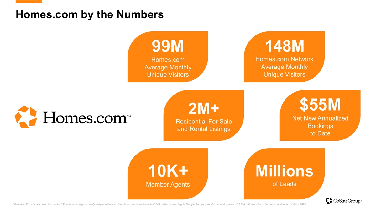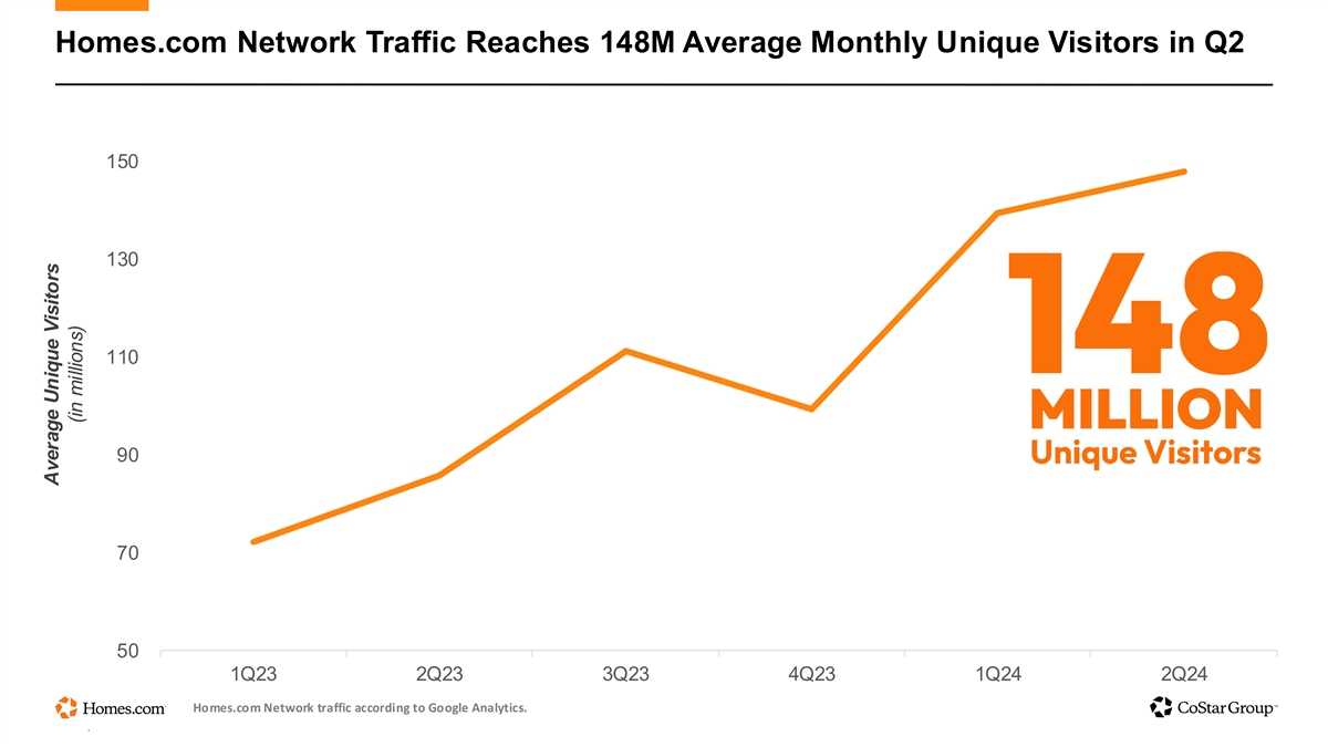 Homes.com Network Traffic Reaches 148M Average Monthly Unique Visitors in Q2 150 130 110 90 70 50 1Q23 2Q23 3Q23 4Q23 1Q24 2Q24 Homes.com Network traffic according to Google Analytics. . Average Unique Visitors (in millions)