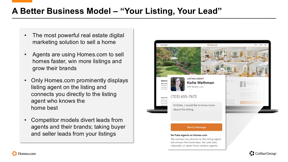 A Better Business Model – “Your Listing, Your Lead” • The most powerful real estate digital marketing solution to sell a home • Agents are using Homes.com to sell homes faster, win more listings and grow their brands • Only Homes.com prominently displays listing agent on the listing and connects you directly to the listing agent who knows the home best • Competitor models divert leads from agents and their brands; taking buyer and seller leads from your listings