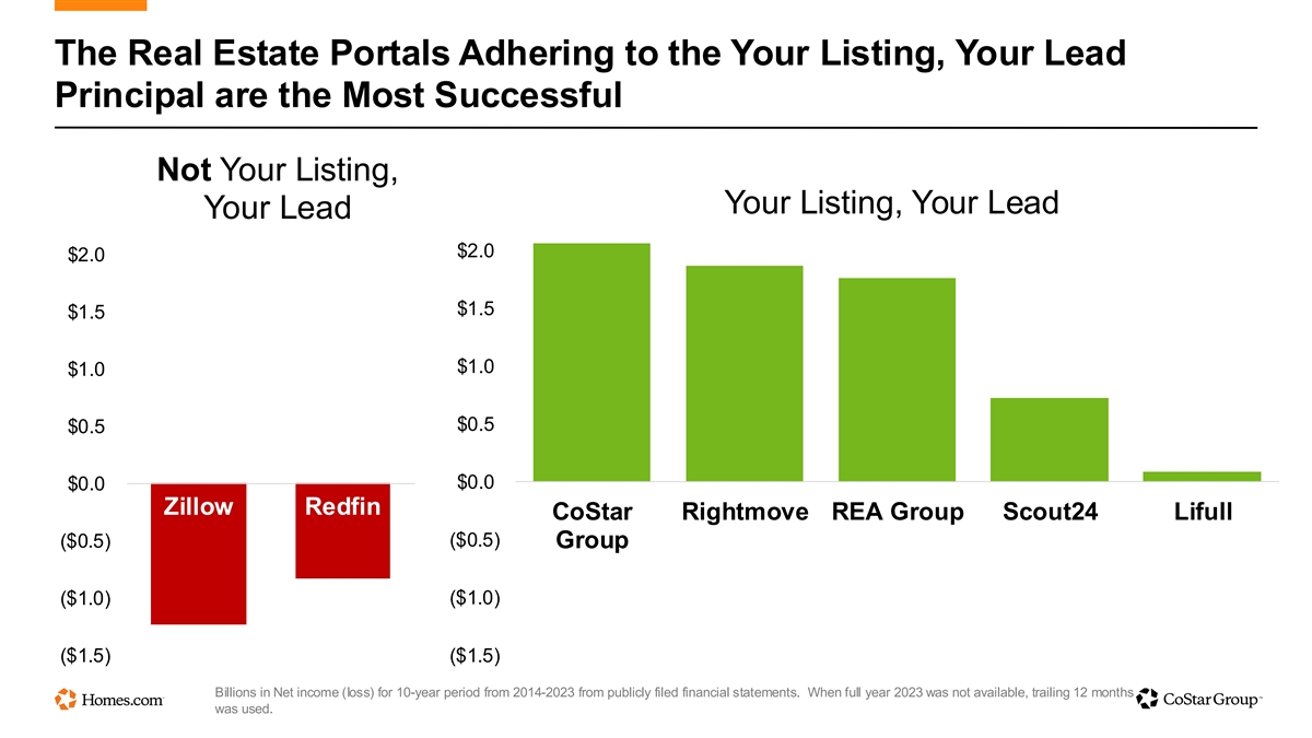 The Real Estate Portals Adhering to the Your Listing, Your Lead Principal are the Most Successful Not Your Listing, Your Listing, Your Lead Your Lead $2.0 $2.0 $1.5 $1.5 $1.0 $1.0 $0.5 $0.5 $0.0 $0.0 Zillow Redfin CoStar Rightmove REA Group Scout24 Lifull ($0.5) ($0.5) Group ($1.0) ($1.0) ($1.5) ($1.5) Billions in Net income (loss) for 10-year period from 2014-2023 from publicly filed financial statements. When full year 2023 was not available, trailing 12 months was used.