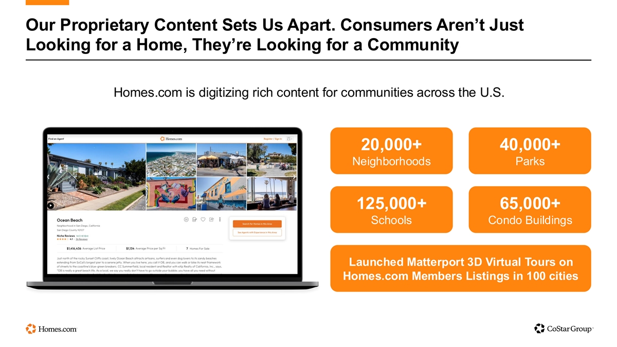 Our Proprietary Content Sets Us Apart. Consumers Aren’t Just Looking for a Home, They’re Looking for a Community Homes.com is digitizing rich content for communities across the U.S. 20,000+ 40,000+ Neighborhoods Parks 125,000+ 65,000+ Schools Condo Buildings Launched Matterport 3D Virtual Tours on Homes.com Members Listings in 100 cities