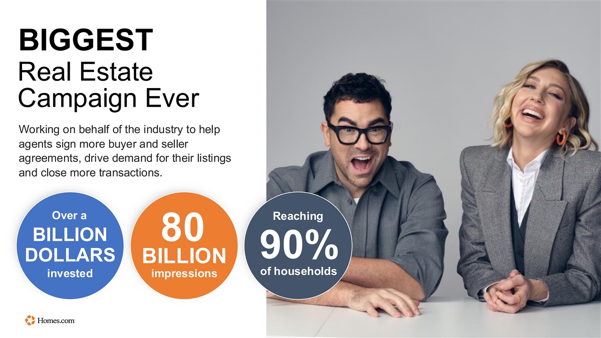 BIGGEST Real Estate Campaign Ever Working on behalf of the industry to help agents sign more buyer and seller agreements, drive demand for their listings and close more transactions. Over a Reaching BILLION 80 90% DOLLARS BILLION of households invested impressions