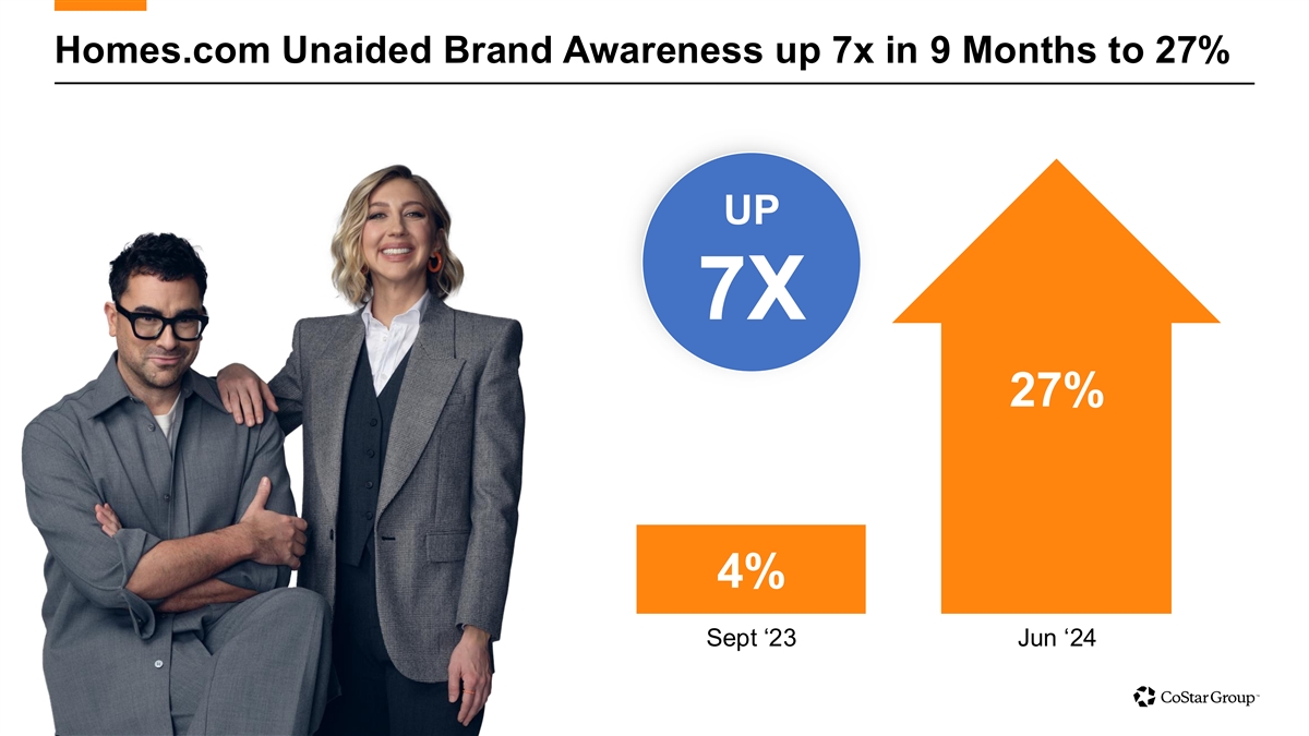 Homes.com Unaided Brand Awareness up 7x in 9 Months to 27% UP 7X 27% 4% Sept ‘23 Jun ‘24