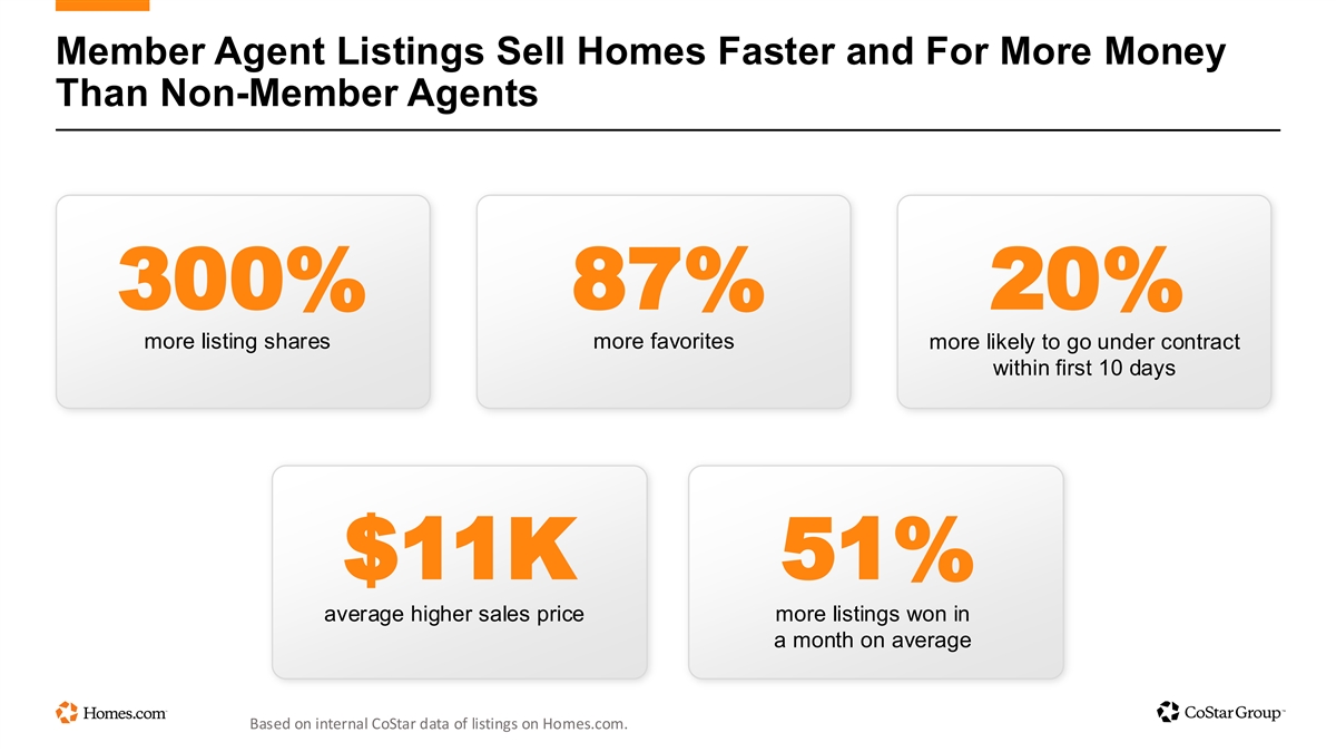 Member Agent Listings Sell Homes Faster and For More Money Than Non-Member Agents 300% 87% 20% more listing shares more favorites more likely to go under contract within first 10 days $11K 51% average higher sales price more listings won in a month on average Based on internal CoStar data of listings on Homes.com.