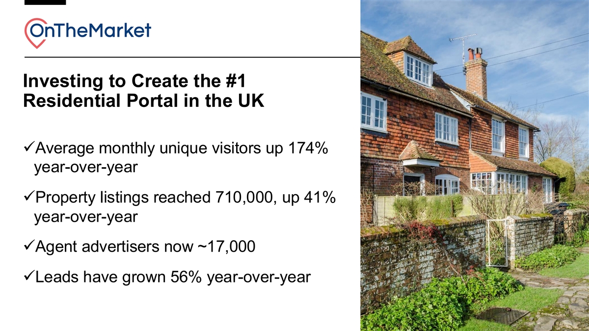 Investing to Create the #1 Residential Portal in the UK ✓Average monthly unique visitors up 174% year-over-year ✓Property listings reached 710,000, up 41% year-over-year ✓Agent advertisers now ~17,000 ✓Leads have grown 56% year-over-year