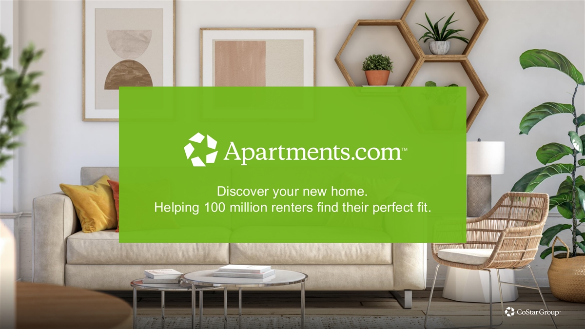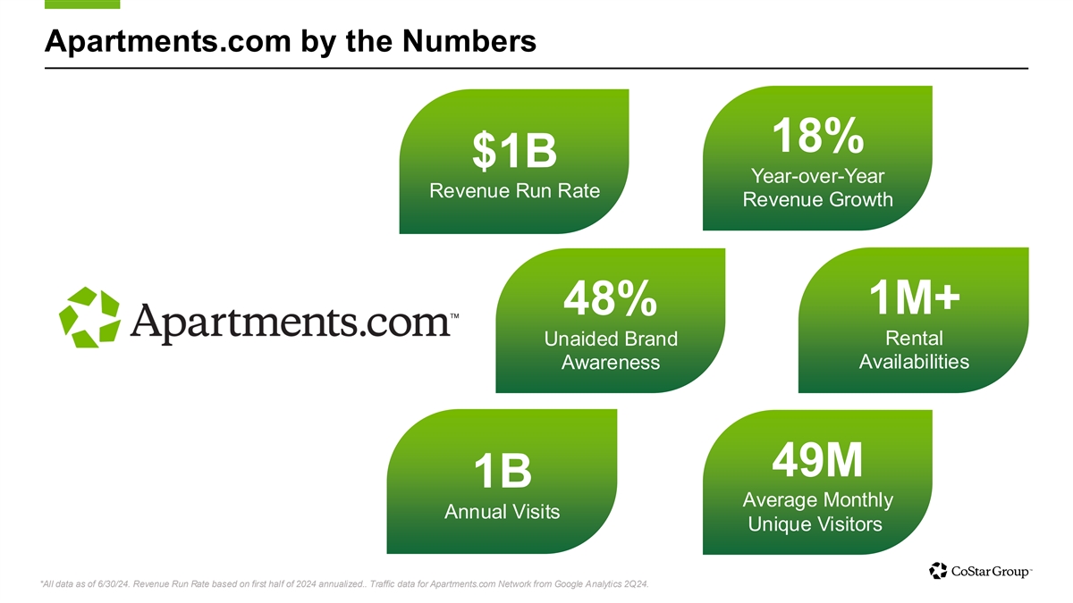 Apartments.com by the Numbers 18% $1B Year-over-Year Revenue Run Rate Revenue Growth 1M+ 48% Rental Unaided Brand Availabilities Awareness 49M 1B Average Monthly Annual Visits Unique Visitors *All data as of 6/30/24. Revenue Run Rate based on first half of 2024 annualized.. Traffic data for Apartments.com Network from Google Analytics 2Q24.