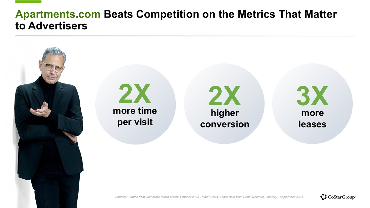 Apartments.com Beats Competition on the Metrics That Matter to Advertisers 2X 2X 3X more time higher more per visit conversion leases Sources: Traffic from Comscore Media Matrix, October 2023 - March 2024; Lease data from Rent Dynamics, January - September 2023