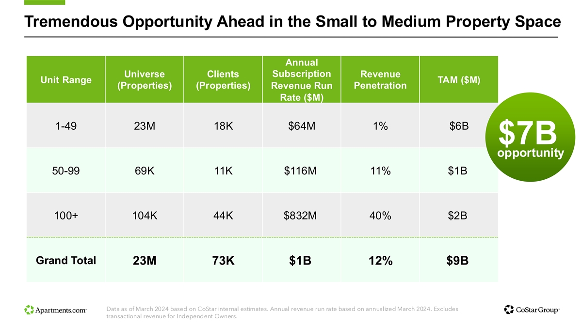 Tremendous Opportunity Ahead in the Small to Medium Property Space Annual Subscription Universe Clients Revenue Unit Range TAM ($M) (Properties) (Properties) Revenue Run Penetration Rate ($M) 1-49 23M 18K $64M 1% $6B $7B opportunity 50-99 69K 11K $116M 11% $1B 100+ 104K 44K $832M 40% $2B Grand Total 23M 73K $1B 12% $9B Data as of March 2024 based on CoStar internal estimates. Annual revenue run rate based on annualized March 2024. Excludes transactional revenue for Independent Owners.
