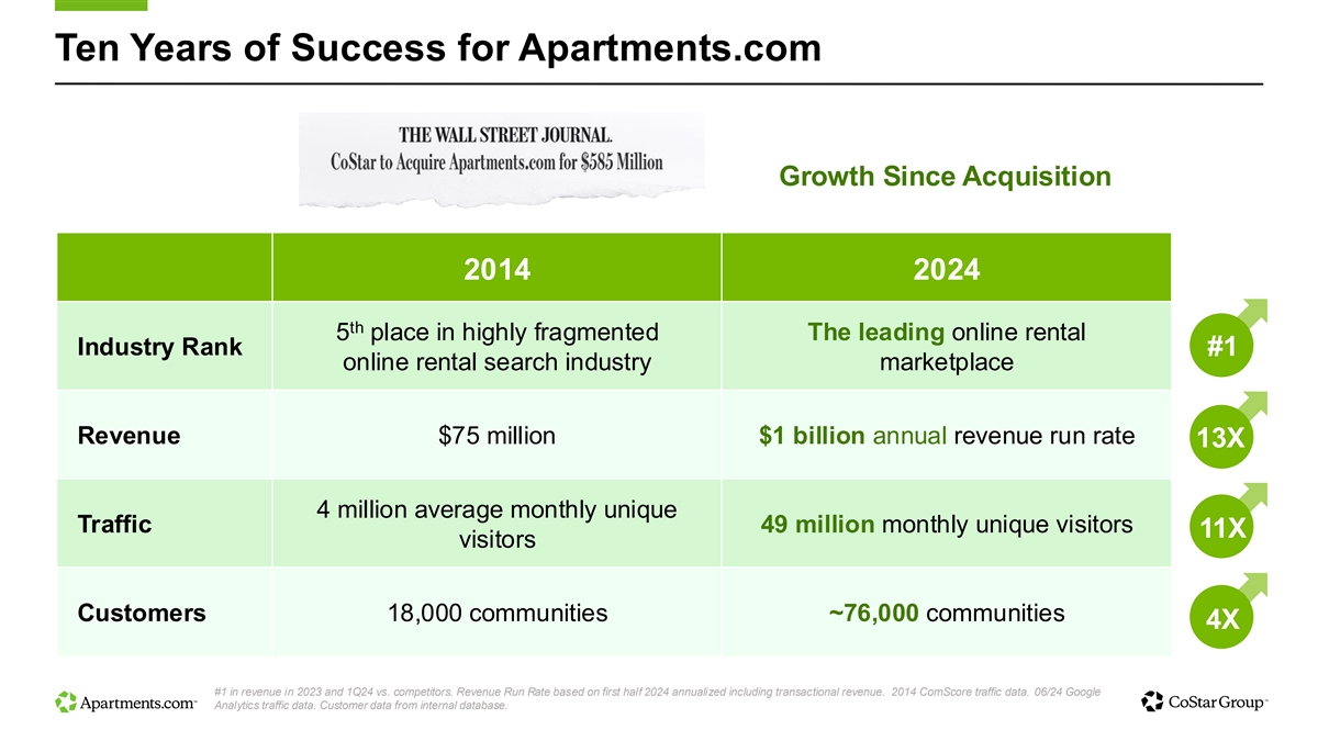 Ten Years of Success for Apartments.com Growth Since Acquisition 2014 2024 th 5 place in highly fragmented The leading online rental Industry Rank #1 online rental search industry marketplace Revenue $75 million $1 billion annual revenue run rate 13X 4 million average monthly unique Traffic 49 million monthly unique visitors 11X visitors Customers 18,000 communities ~76,000 communities 4X #1 in revenue in 2023 and 1Q24 vs. competitors. Revenue Run Rate based on first half 2024 annualized including transactional revenue. 2014 ComScore traffic data. 06/24 Google Analytics traffic data. Customer data from internal database.
