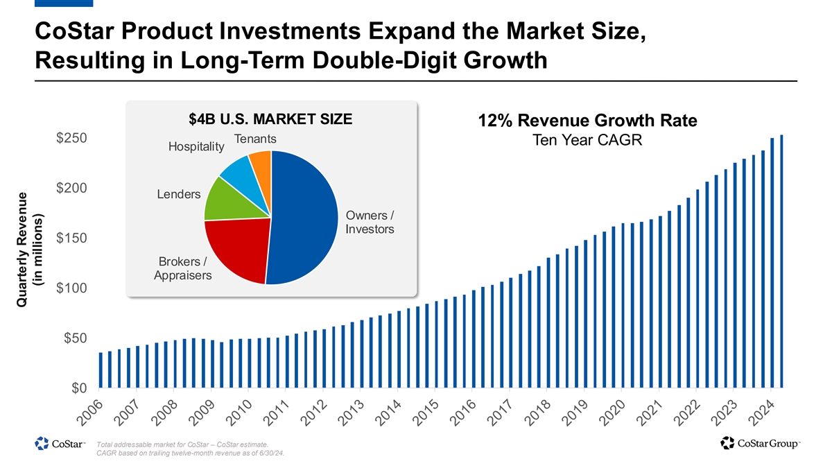 CoStar Product Investments Expand the Market Size, Resulting in Long-Term Double-Digit Growth $4B U.S. MARKET SIZE 12% Revenue Growth Rate $250 Tenants Ten Year CAGR Hospitality $200 Lenders Owners / Investors $150 Brokers / Appraisers $100 $50 $0 Total addressable market for CoStar – CoStar estimate. CAGR based on trailing twelve-month revenue as of 6/30/24. Quarterly Revenue (in millions)