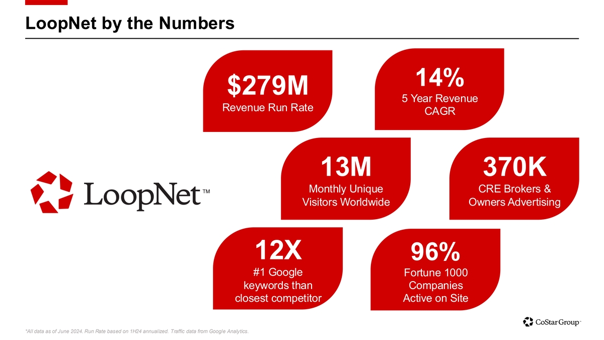 LoopNet by the Numbers 14% $279M 5 Year Revenue Revenue Run Rate CAGR 13M 370K Monthly Unique CRE Brokers & Visitors Worldwide Owners Advertising 12X 96% #1 Google Fortune 1000 keywords than Companies closest competitor Active on Site *All data as of June 2024. Run Rate based on 1H24 annualized. Traffic data from Google Analytics.