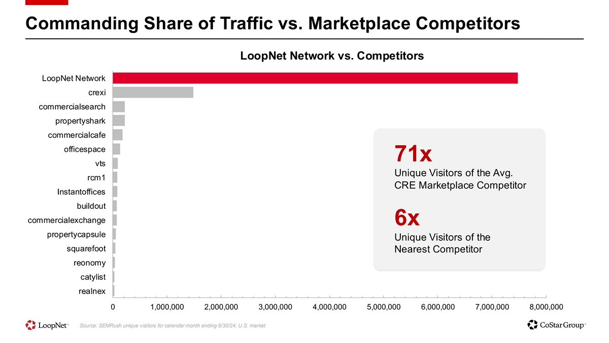 Commanding Share of Traffic vs. Marketplace Competitors LoopNet Network vs. Competitors LoopNet Network crexi commercialsearch propertyshark commercialcafe officespace 71x vts Unique Visitors of the Avg. rcm1 CRE Marketplace Competitor Instantoffices buildout commercialexchange 6x propertycapsule Unique Visitors of the squarefoot Nearest Competitor reonomy catylist realnex 0 1,000,000 2,000,000 3,000,000 4,000,000 5,000,000 6,000,000 7,000,000 8,000,000 Source: SEMRush unique visitors for calendar month ending 6/30/24; U.S. market