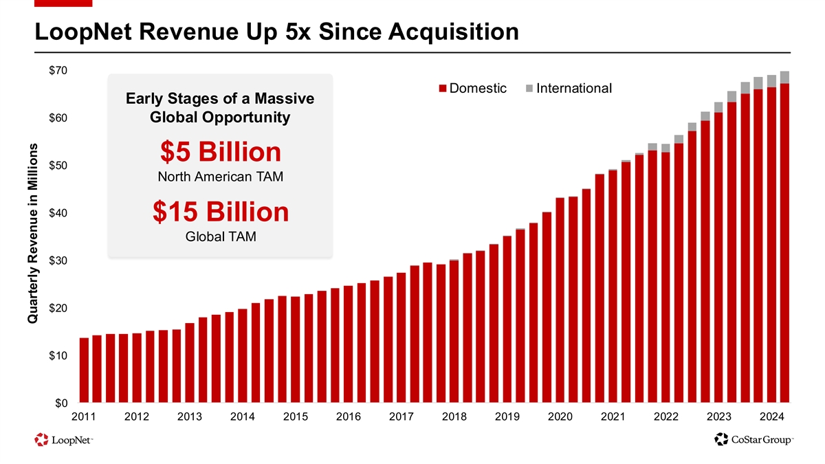 LoopNet Revenue Up 5x Since Acquisition $70 Domestic International Early Stages of a Massive $60 Global Opportunity $5 Billion $50 North American TAM $40 $15 Billion Global TAM $30 $20 $10 $0 2011 2012 2013 2014 2015 2016 2017 2018 2019 2020 2021 2022 2023 2024 Quarterly Revenue in Millions