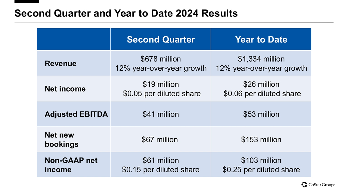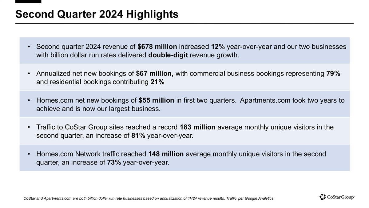 Second Quarter 2024 Highlights • Second quarter 2024 revenue of $678 million increased 12% year-over-year and our two businesses with billion dollar run rates delivered double-digit revenue growth. • Annualized net new bookings of $67 million, with commercial business bookings representing 79% and residential bookings contributing 21% • Homes.com net new bookings of $55 million in first two quarters. Apartments.com took two years to achieve and is now our largest business. • Traffic to CoStar Group sites reached a record 183 million average monthly unique visitors in the second quarter, an increase of 81% year-over-year. • Homes.com Network traffic reached 148 million average monthly unique visitors in the second quarter, an increase of 73% year-over-year. CoStar and Apartments.com are both billion dollar run rate businesses based on annualization of 1H24 revenue results. Traffic per Google Analytics. *