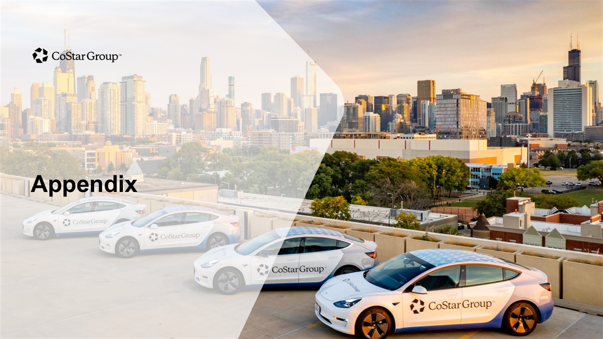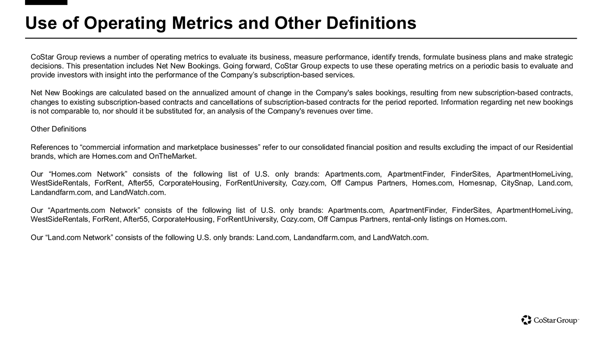Use of Operating Metrics and Other Definitions CoStar Group reviews a number of operating metrics to evaluate its business, measure performance, identify trends, formulate business plans and make strategic decisions. This presentation includes Net New Bookings. Going forward, CoStar Group expects to use these operating metrics on a periodic basis to evaluate and provide investors with insight into the performance of the Company’s subscription-based services. Net New Bookings are calculated based on the annualized amount of change in the Company's sales bookings, resulting from new subscription-based contracts, changes to existing subscription-based contracts and cancellations of subscription-based contracts for the period reported. Information regarding net new bookings is not comparable to, nor should it be substituted for, an analysis of the Company's revenues over time. Other Definitions References to “commercial information and marketplace businesses” refer to our consolidated financial position and results excluding the impact of our Residential brands, which are Homes.com and OnTheMarket. Our “Homes.com Network” consists of the following list of U.S. only brands: Apartments.com, ApartmentFinder, FinderSites, ApartmentHomeLiving, WestSideRentals, ForRent, After55, CorporateHousing, ForRentUniversity, Cozy.com, Off Campus Partners, Homes.com, Homesnap, CitySnap, Land.com, Landandfarm.com, and LandWatch.com. Our “Apartments.com Network” consists of the following list of U.S. only brands: Apartments.com, ApartmentFinder, FinderSites, ApartmentHomeLiving, WestSideRentals, ForRent, After55, CorporateHousing, ForRentUniversity, Cozy.com, Off Campus Partners, rental-only listings on Homes.com. Our “Land.com Network” consists of the following U.S. only brands: Land.com, Landandfarm.com, and LandWatch.com.